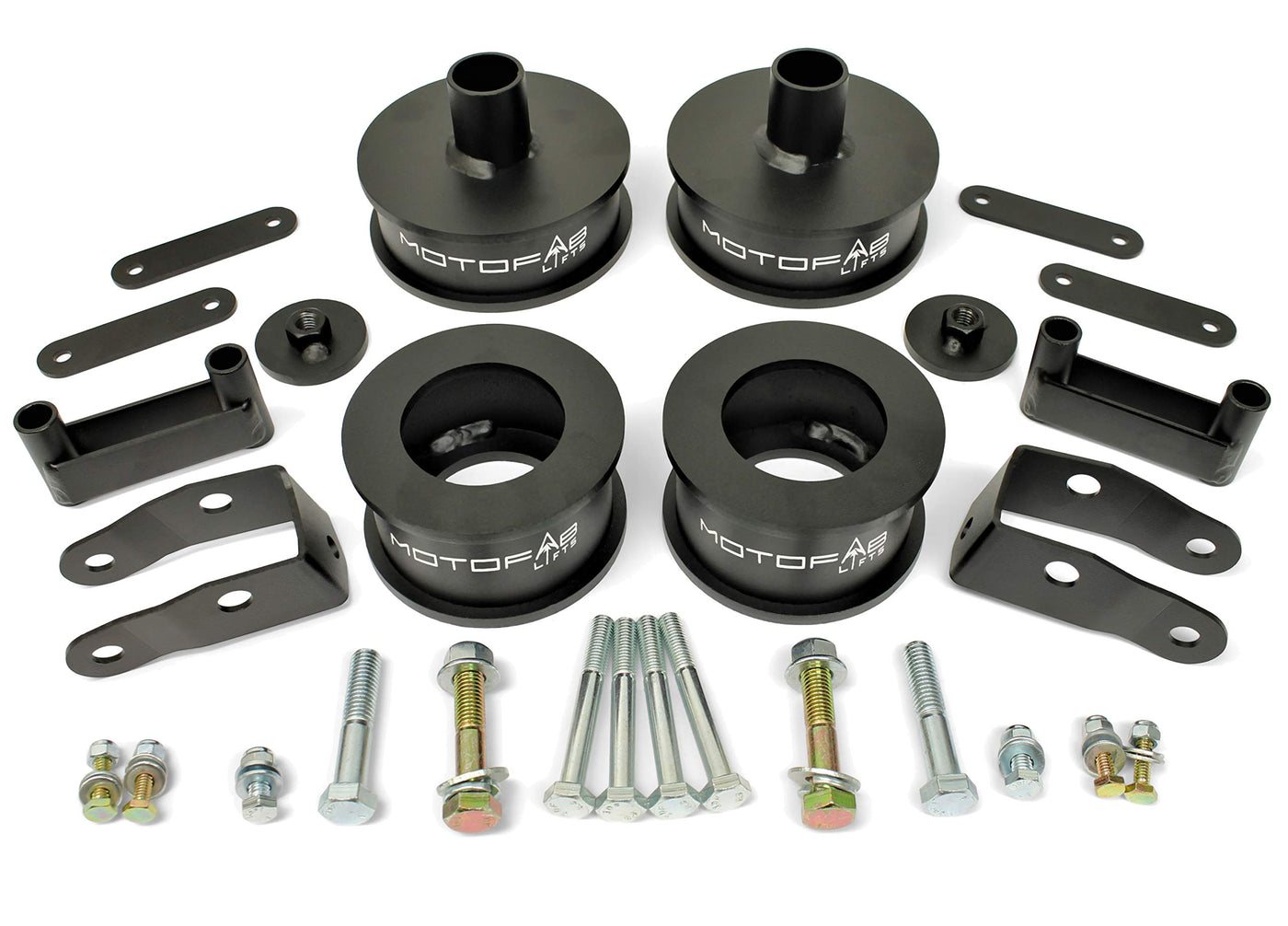 Q: What is included in the lift kit package?A: The lift kit package includes 2 Front Coil Spacers, 2 Rear Coil Spacers, 2 Front Shock Extenders, 2 Rear Shock Extenders, Front and Rear Brake Line Brackets, all necessary hardware, and detailed installation instructions.