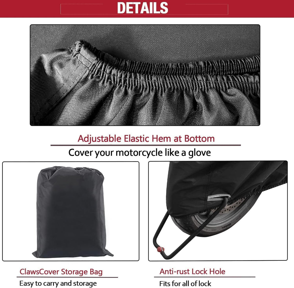 *****About Size***** The size of your bike is less than 2-4 inch than the cover, it is most suitable,so measures size before you pruchase please,Thank You! ClawsCover founder Evan is a motorcycle rider,we have focus on produce outdoor covers,we have motorcycle cover/ATV cover /UTV cover /bike cover /mobility scooter cover/PingPong table cover/outdoor sofa cover, the brand name(ClawsCover) means to can not broken by the wolf's claws,the cover should be durable & waterproof & windproof & sun protection & dust protection and more,we hope all of the covers can solve your needs,save your money and being happy own it. if have any quality defects and wrong size,24 hours contact us for free,we'll give a satisfy answer for you! Specifications:Brand:ClawsCover Size: L x H x W -104x47x51 inches, Material: 420D polyester oxford cloth,Reflective stripe :7 stripes ,Lockhole:1 hole,windproof strap:3 adjustable windproof straps,Vents quantity:2 vents ,Elastic band:all elastic band at the bottom of cover,other cover just have a part elastic band,Washing:hand wash or washing machine,Net Weight:2.5 pounds Package size:13.7x11.8 inches,Features: Heavy duty Waterproof Windproof Snowproof Dustproof Tearproof UV Protection Fadeless Package Inclued:1 * ClawsCover Motorcycle Cover 1 * Easy To Carry Storage Bag *****Very Important***** 1. When use the bike cover please tight the windproof straps avoild to being blown into the water.2. When you storage the cover, keep it dry for longer life. 3. Any cover with vents maybe enter a little water when it is blowing strong winds, please paying particular attention to this situation.4. If the size don't fit your car,you can return it,but don't damage the cover and storage bag,thank you.