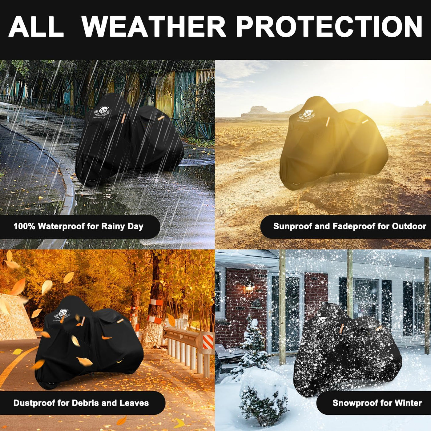 *****About Size***** The size of your bike is less than 2-4 inch than the cover, it is most suitable,so measures size before you pruchase please,Thank You!ClawsCover founder Evan is a motorcycle rider,we have focus on produce outdoor covers,we have motorcycle cover/ATV cover /UTV cover /bike cover /mobility scooter cover/PingPong table cover/outdoor sofa cover, the brand name(ClawsCover) means to can not broken by the wolf's claws,the cover should be durable & waterproof & windproof & sun protection & dust protection and more,we hope all of the covers can solve your needs,save your money and being happy own it. if have any quality defects and wrong size,24 hours contact us for free,we'll give a satisfy answer for you!Specifications:Brand:ClawsCover Size:L x H x W -116x47.2x55 inches Material: 420D oxford cloth Reflective strap :2 straps Lockhole:1 hole windproof strap:3 adjustable windproof straps Vents quantity:2 vents Elastic band:all elastic band at the bottom of cover,other cover just have a part elastic band Washing:hand wash or washing machine Net Weight:2.4 pounds Package size:13.7x11.8 inches Features: Heavy duty Waterproof Windproof Snowproof Dustproof Tearproof UV Protection Fadeless Package Inclued:1 * ClawsCover Motorcycle Cover 1 * Easy To Carry Storage Bag *****Very Important***** 1.When use the bike cover please tight the windproof straps avoild to being blown into the water.2.When you storage the cover, keep it dry for longer life. 3.Any cover with vents maybe enter a little water when it is blowing strong winds, please paying particular attention to this situation.4.If the size don't fit your car,you can return it,but don't damage the cover and storage bag,thank you.