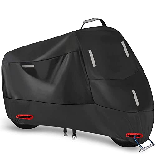 Q: How does the reflective feature enhance safety?A: This motorcycle cover features five high-visibility reflective strips—three at the front and two at the back—along with a reflective handle on top. These elements make it easier to locate your motorcycle in low light conditions and increase visibility to prevent accidents.