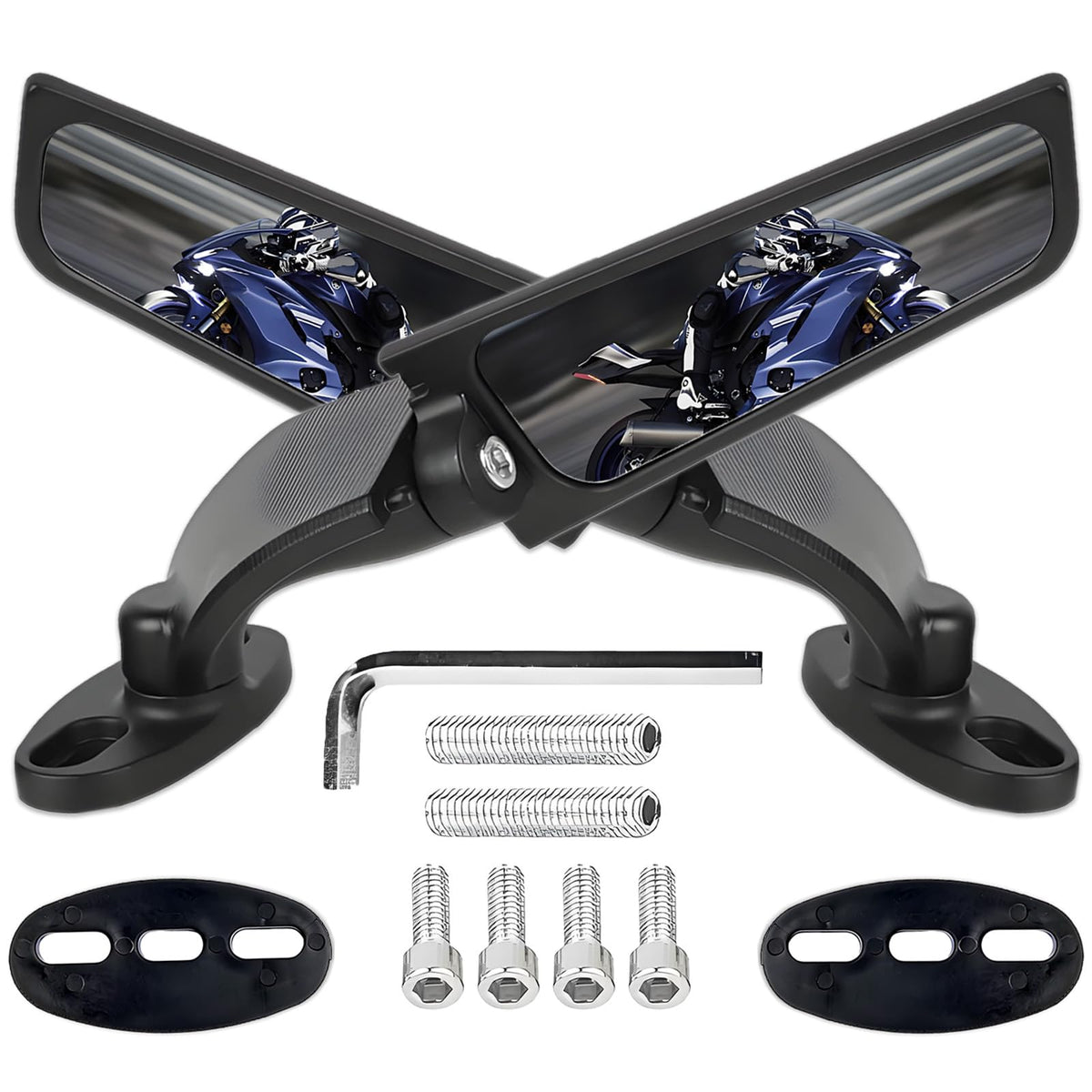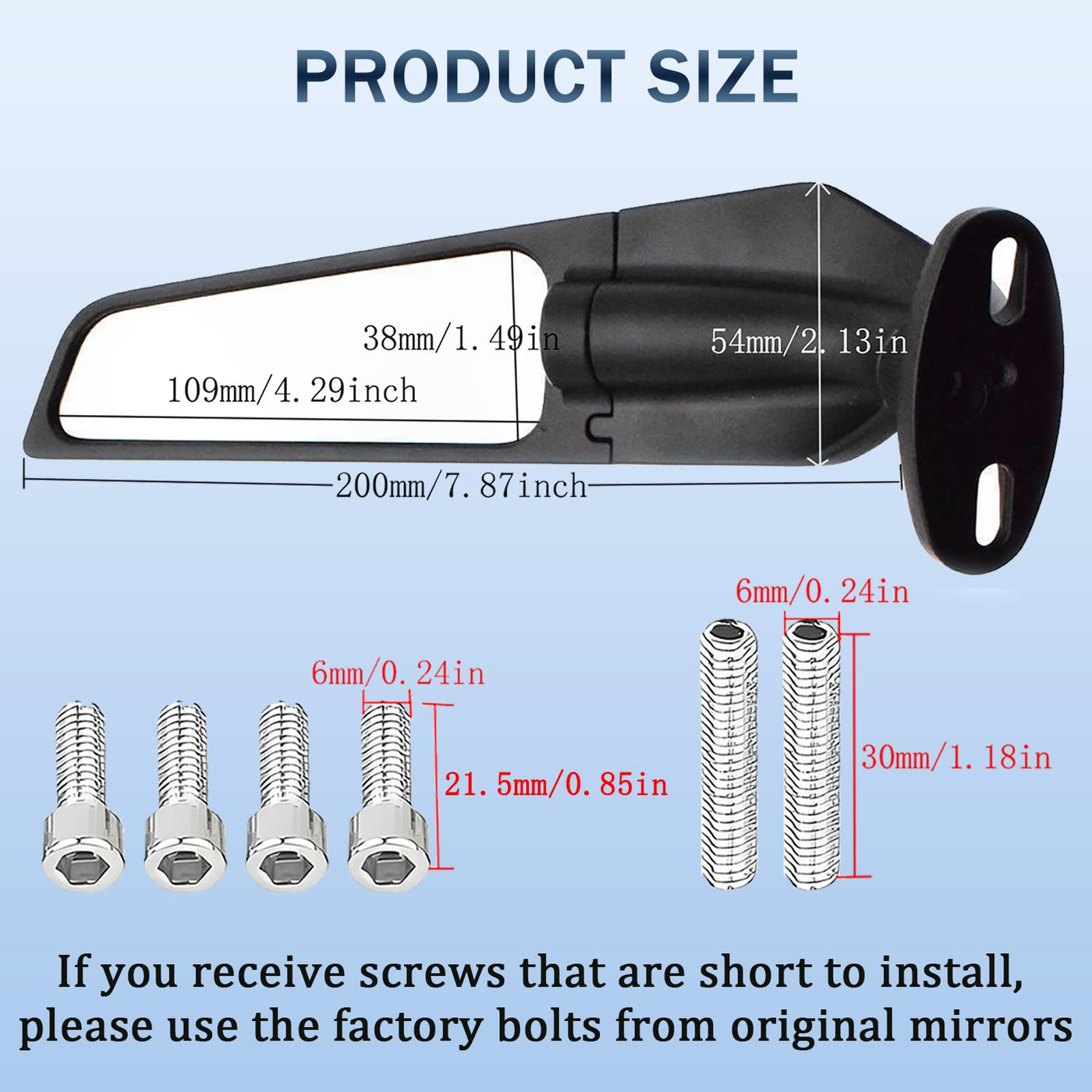 Widely adaptable, diverse choices Our motorcycle rearview mirrors are designed specifically for super sport motorcycles and are widely compatible with popular models such as Honda CBR series (such as CBR250R, CBR600RR, CBR1000RR, etc.), Kawasaki Ninja series (such as Ninja 300, Ninja 400, Ninja 650, ZX6R, ZX10R, etc.), Suzuki GSXR series (such as GSXR600, GSXR750, GSXR1000, etc.), and Yamaha R series (such as R15, R25, R3, R6S, etc.). Please refer to the detailed description for the specific year and model of adaptation. 360 degree rotation, freely adjustable The rearview mirror adopts a 360 degree rotating design, which can be freely adjusted to the optimal viewing angle according to the needs of drivers of different heights, ensuring a safe view during cycling. Whether observing the road conditions behind or the side rear view, it can be easily handled. High definition convex mirror, wide field of view Adopting high-definition convex mirror design, it can provide a wider field of view compared to ordinary rearview mirrors, allowing drivers to have a clear and broad field of view during both day and night. Whether it's city streets or highways, they can be easily controlled. Cool appearance, practical design The rearview mirror adopts a wing shaped design, which not only enhances the overall aesthetics of the motorcycle, but also effectively reduces resistance during driving, improving the riding experience. Unique exterior design allows you to stand out among the crowd and become the focus. Durable and sturdy The rearview mirror is made of high-strength aluminum alloy material, which has the advantages of high hardness, wear resistance, oxidation resistance, etc. Even under extreme weather conditions, it can maintain good performance. At the same time, we also provide specialized installation tools and screws to ensure a simple and fast installation process.