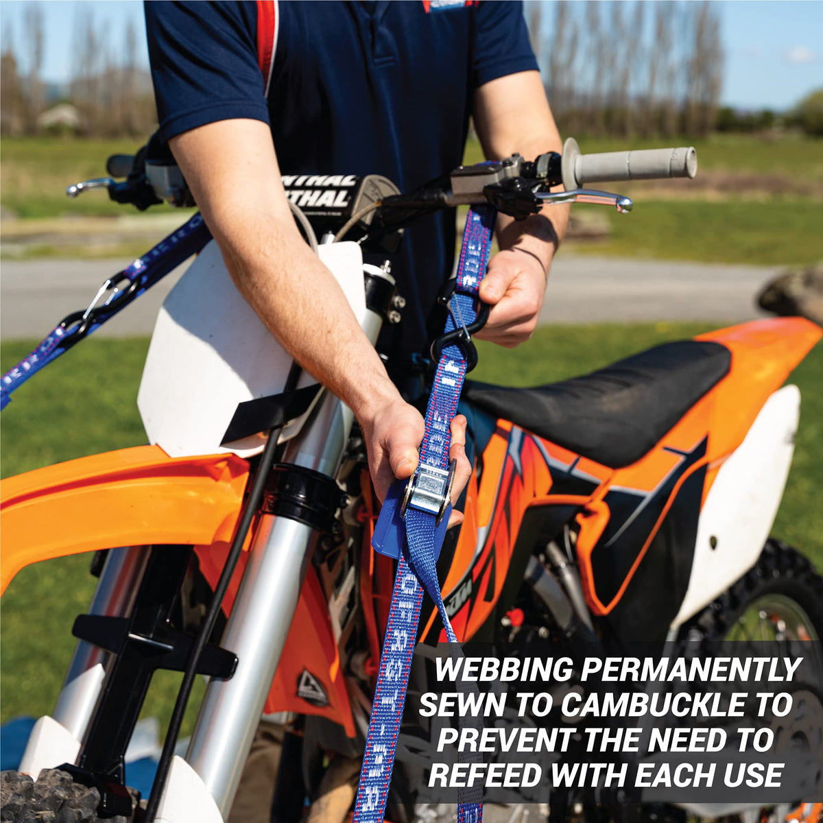 Looking for tough tested Motorcycle Tiedowns that will stand the test of time in the harshest conditions? Aerofast’s Motorcycle Camlock Strap Tie Down will do the job! These Tiedowns are designed specifically for the transportation of Motorcycles, Dirtbikes, ATV’s and UTV’s. This model exclusively features an innovative Safety Clip S-Hook which allows for flexibility with attachment points as it minimizes the webbing from twisting, so it WON’T jam in the Ratchet mechanism. The safety mechanism on the Swivel Carabiner ensures your motorcycle, UTV or ATV stays secure when transporting even over rough terrain. Aerofast Features: - Thicker Webbing – which makes it more durable. Almost double the thickness of the webbing from a major competitors product - Ratchet has molded handles vs soft rubber handles which are stuck or glued on, and often fall off - 11 cog ratchet for finer adjustment - UV treated polypropylene yarn for longevity and does not stretch or lose strength when wet as opposed to polyester, Most other brands use polyester yarn Recommended Use: - Motorcycles - Dirtbikes - Quad bikes - UTV - ATV Product Inclusions: - 2x Motorcycle ratchet tie-downs with Safety Swivel Carabiner - 1 x heavy duty storage bag Product Specifications: Break Strength: 3,000lbs per tiedown or 6,000lbs per pair Length: 8 ft Width: 1.5” Tensioner: Cambuckle Attachment: Soft Loop Material: Polypropylene Webbing World #1 Tiedown Manufacturer We have been New Zealand’s leading manufacturer and supplier of load restraint products for over 30 years! The foundation for this success has been built from sourcing only the best yarns and components we can find from around the world. Each component is put through our strict testing regime to ensure they meet our demanding quality standards.