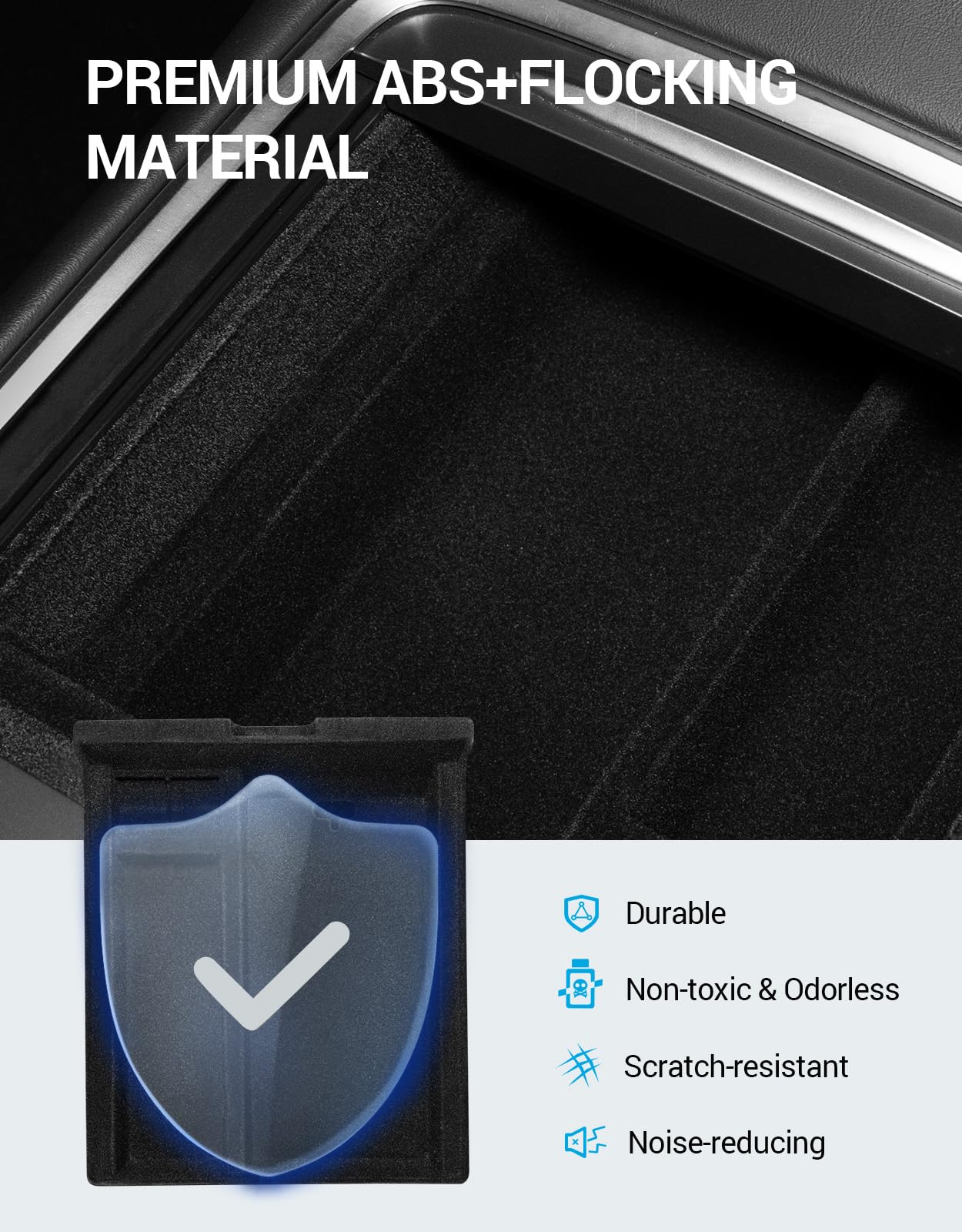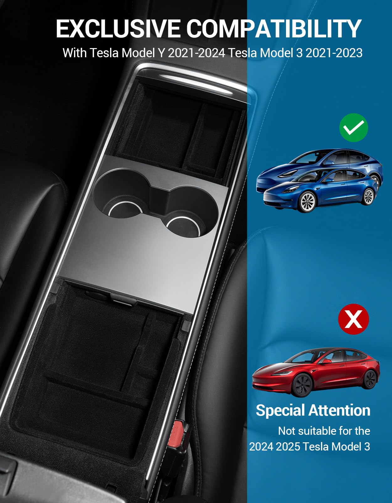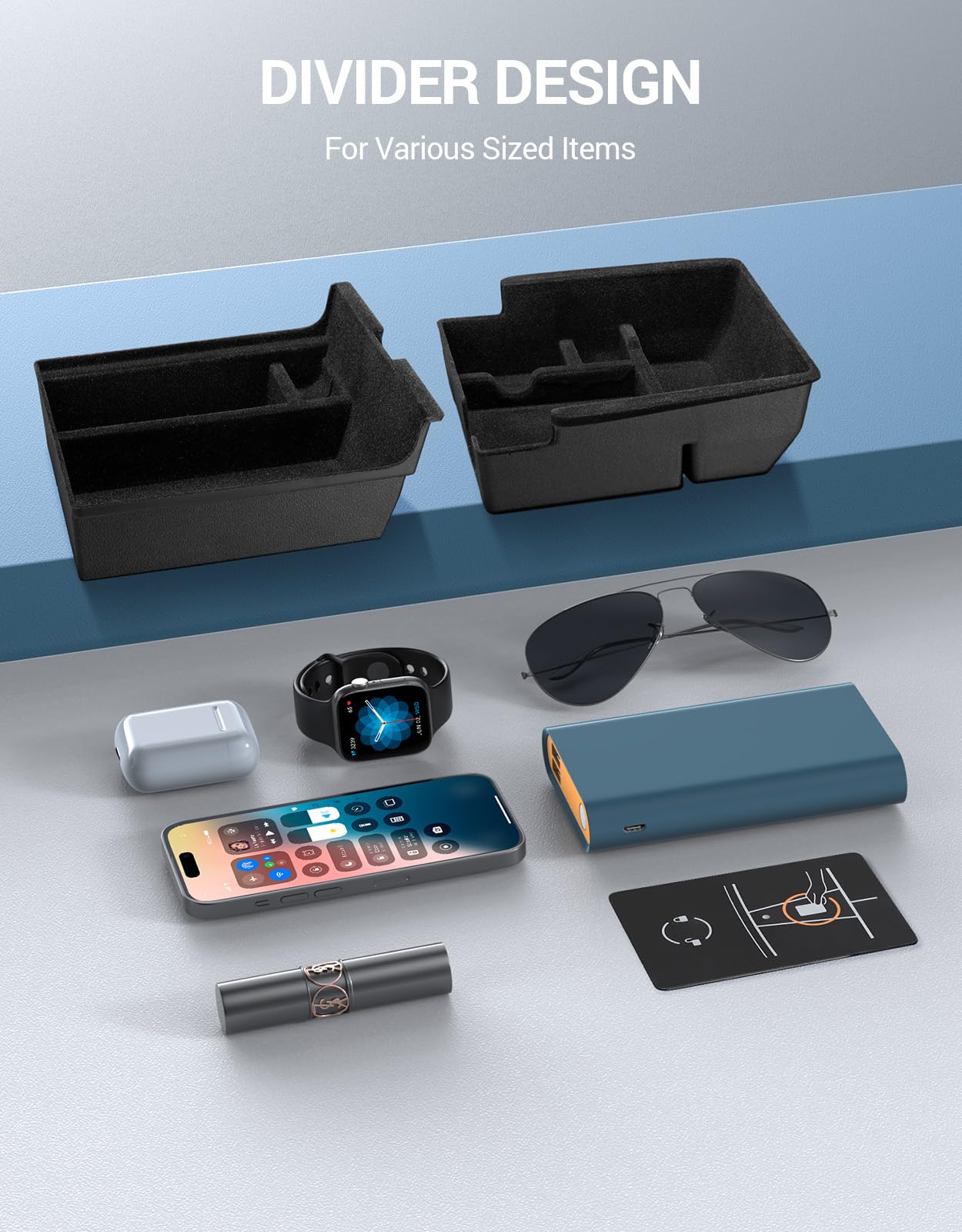 Motrobe center console organizer is custom-cut specifically for the 2021-2024 Tesla Model Y, ensuring a perfect fit and keeping your console in impeccable order. The package includes a cup holder, center console organizer, armrest storage, armrest hidden storage box, and under-seat storage.