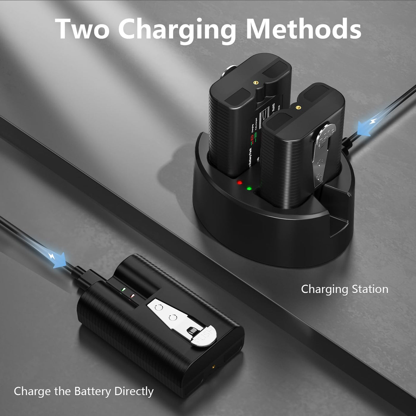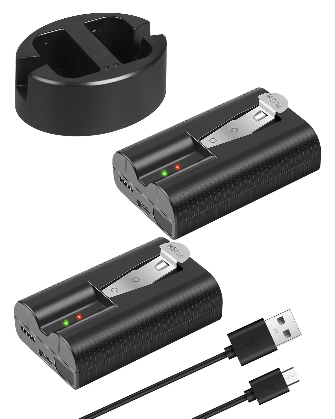 Q: Can I use the batteries while they are charging?A: It is recommended to charge the batteries fully before use for optimal performance. While the dual charging dock allows for convenient charging, using the batteries while charging may affect their lifespan and performance.