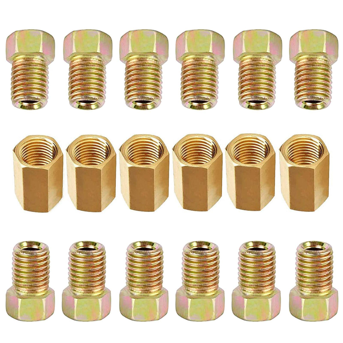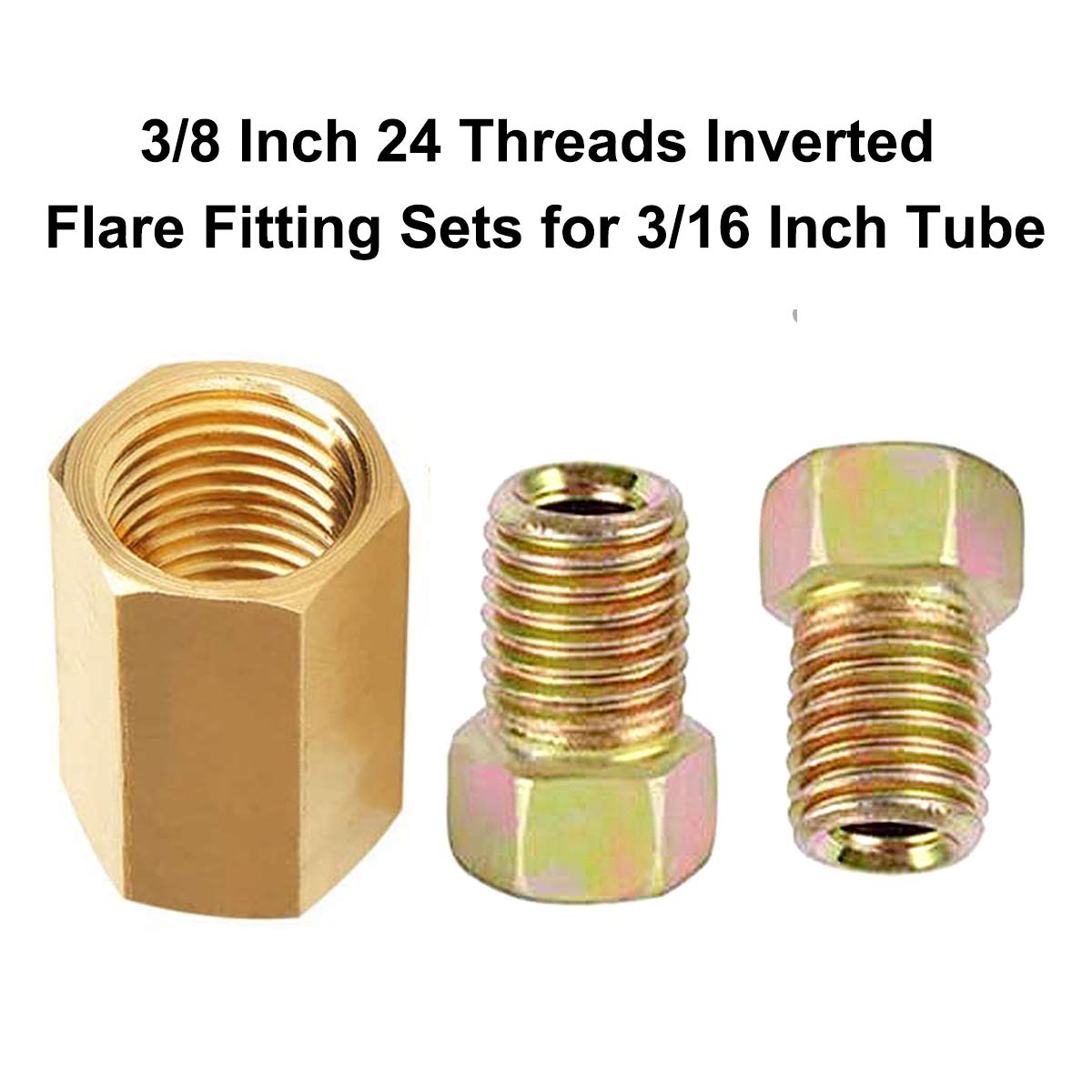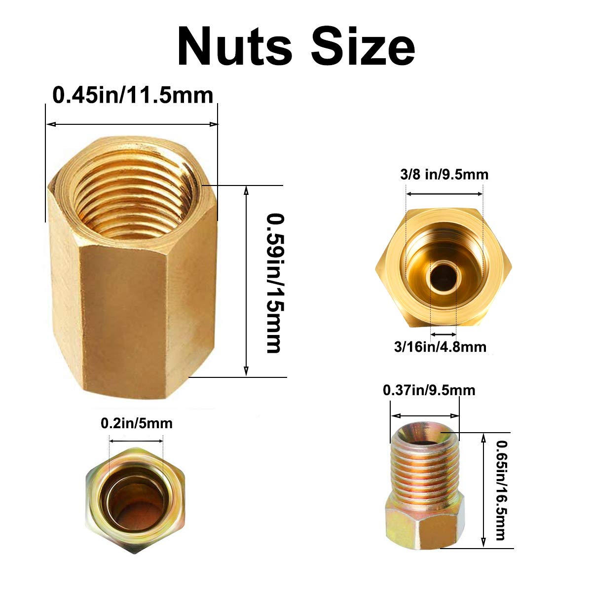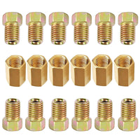 The MuHize upgraded brake line fittings and unions are constructed from durable brass and feature a unique rust corrosion proofing technology, ensuring long-lasting performance. This fitting assortment is designed specifically for 3/16'' brake line applications, making it a perfect choice for various brake line repair or installation projects. Included in the package are: 1. 6 x 3/8-24 threads unions 2. 12 x 3/8-24 threads nuts With these high-quality fittings and unions, you can easily and securely connect your 3/16'' brake lines, ensuring a leak-free and reliable brake system. The durable brass construction provides added strength and resistance to corrosion, making these fittings ideal for use in various automotive, industrial, or other applications where brake lines are required. Upgrade your brake lines with the MuHize brass fittings and unions for enhanced durability and performance. This assortment of fittings is a practical and convenient solution for your 3/16'' brake line needs.