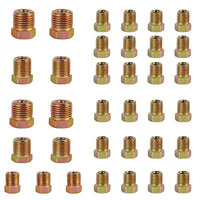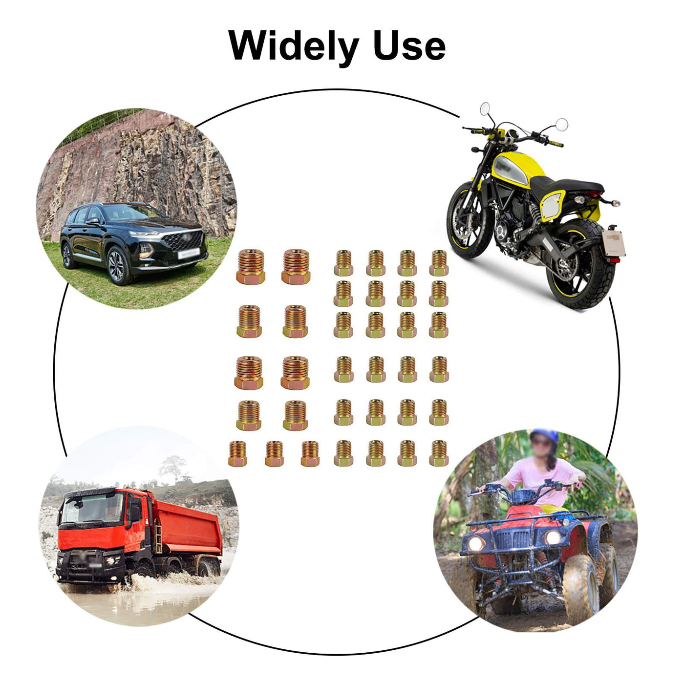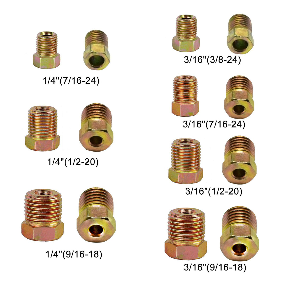 Muhize Upgraded Brake Line Fittings Are Made Of Durable Material With Unique Rust Corrosion Proofing Technology.This Fitting Kit Includes 19 Fittings For 3/16” Brake Line And 16 Fittings For 1/4” Brake Line:3/16”:? 3 X 3/16” (7/16-24) Inverted Tube Nut;? 12 X 3/16' (3/8-24) Inverted Tube Nut;? 2 X 3/16” (1/2-20) Inverted Tube Nut;? 2 X 3/16' (9/16-18) Inverted Tube Nut.1/4”:? 12 X 1/4” (7/16-24) Inverted Tube Nut;? 2 X 1/4” (9/16-18) Inverted Tube Nut;? 2 X 1/4” (1/2-20) Inverted Tube Nut.