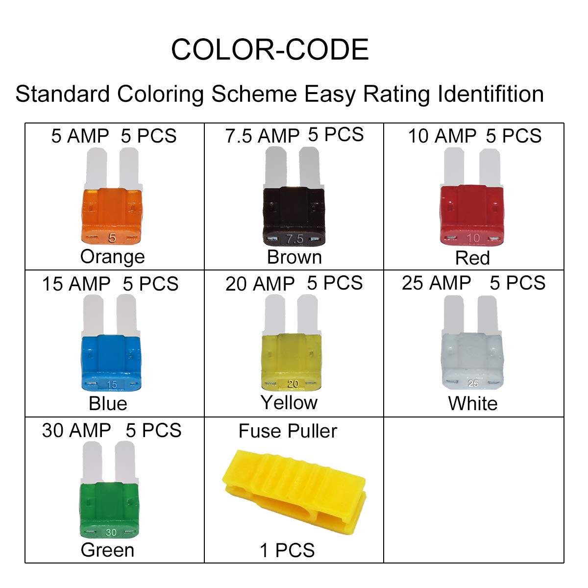 Q: How many pieces and amp ratings are included in the MuHize Micro2 Fuses Assortment Kit?A: The MuHize Micro2 Fuses Assortment Kit includes 35 pieces in total, featuring seven different amp ratings: 5A, 7.5A, 10A, 15A, 20A, 25A, and 30A. There are five pieces of each rating, ensuring you have a variety of options for different applications.