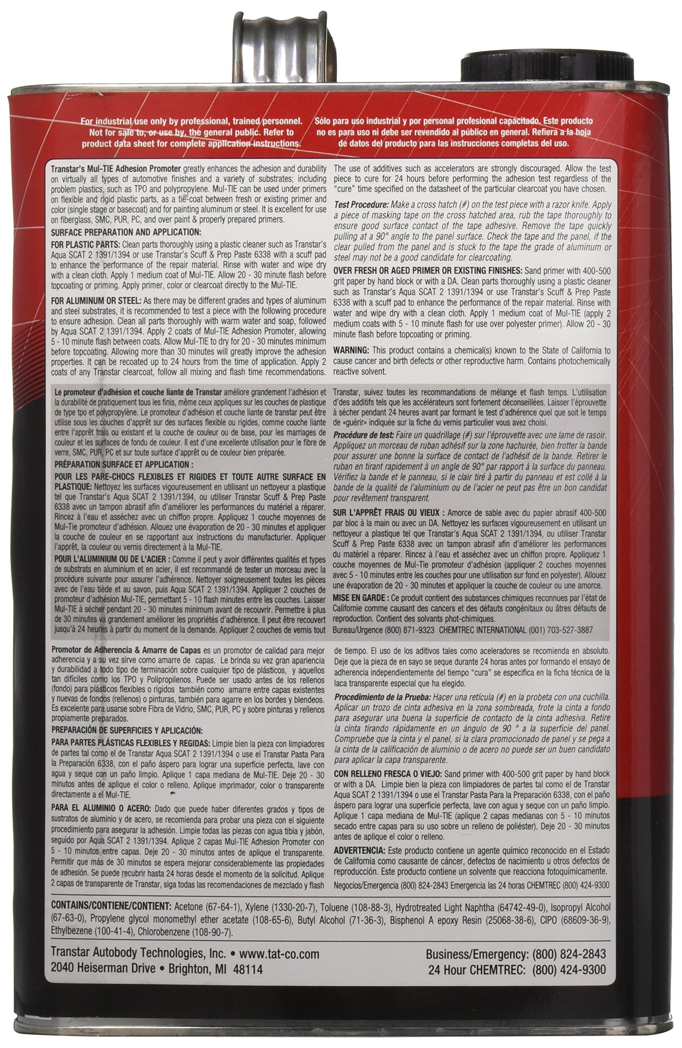 Transtars Mul-Tie Adhesion Promoter & Tie-Coat Greatly Enhances The Adhesion, Appearance And Durability Of Virtually All Types Of Finishes, Even When Applied Over Difficult Types Of Plastics Such As Tpo And Polypropylene. Mul-Tie Adhesion Promoter & Tie-Coat Can Be Used Under Primers On Flexible And Rigid Plastic Parts, As A Tie-Coat Between Fresh Or Existing Primer And Color Or Base Coat, And For Edging And Blend Areas. It Is Excellent For Use On Fiberglass, Smc, Pur, Pc And Over Properly Prepared Primers And Coatings.Warning: This Product Can Expose You To Chemicals Including Lead Which Is Known To The State Of California To Cause Cancer. For More Info Go To Www.P65Warnings.Ca.Gov.