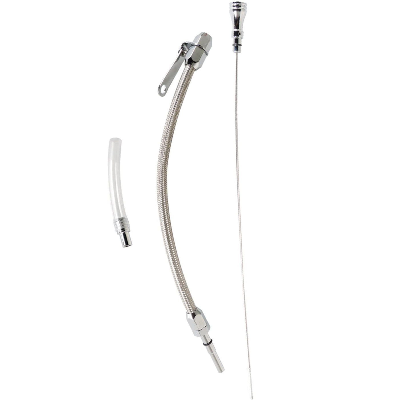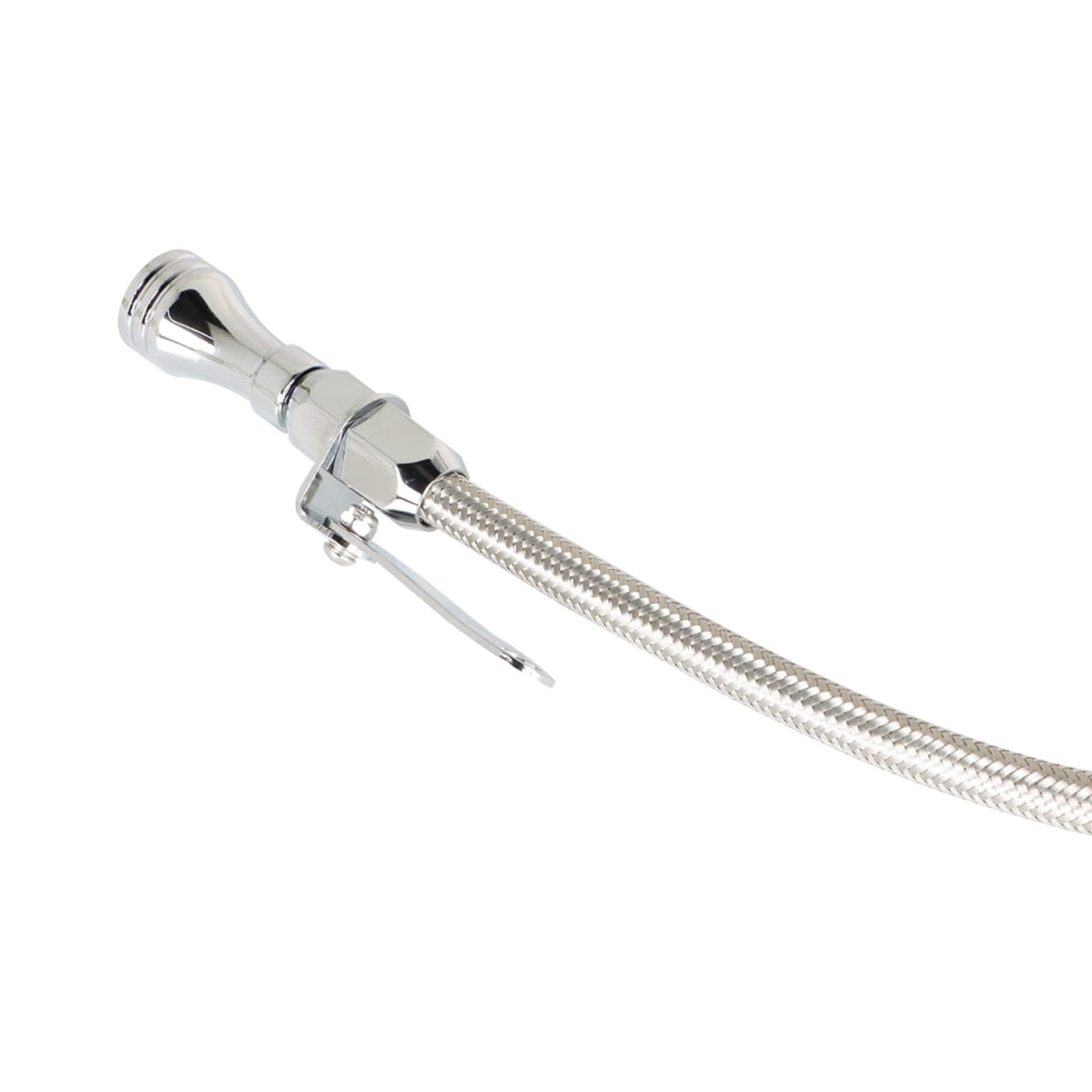 Q: How does the flexible design of the dipstick benefit users?A: The flexible stainless steel braided shell allows for easier maneuverability within the engine bay, making it simpler to check oil levels without damaging components.