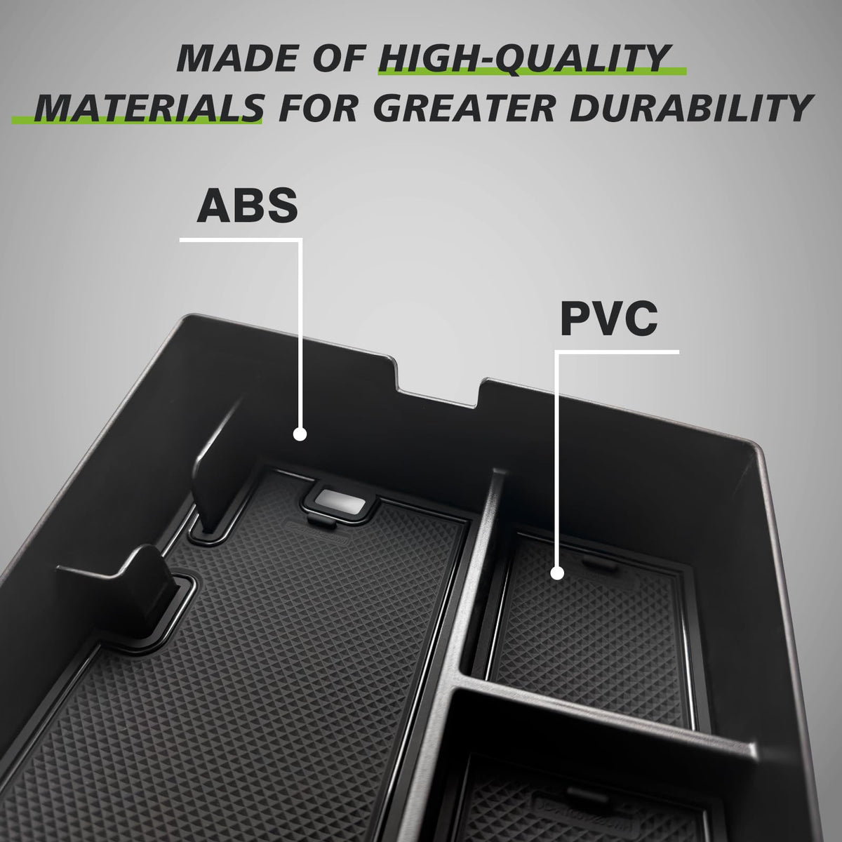 Q: What materials are used in the Muslogy Center Console Organizer?A: The organizer is made from high-quality ABS material, which is durable and wear-resistant. Additionally, it comes with insert mats made from premium PVC material that are odorless and waterproof.