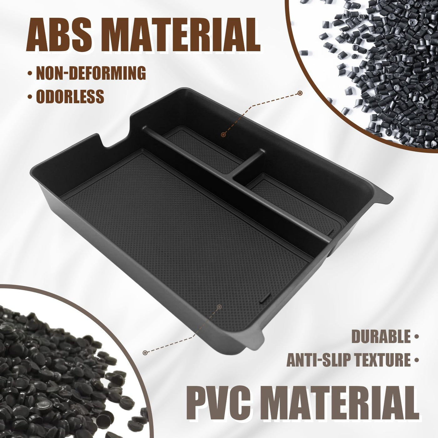Q: What material is the Muslogy Center Console Organizer made of?A: The organizer is made of high-quality ABS plastic, which is durable, non-deforming, and wear-resistant, ensuring long-lasting use.