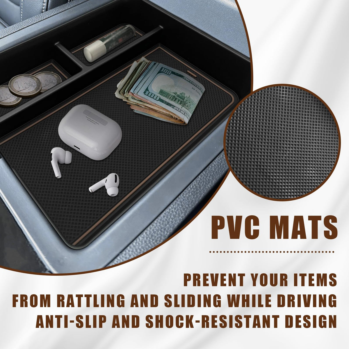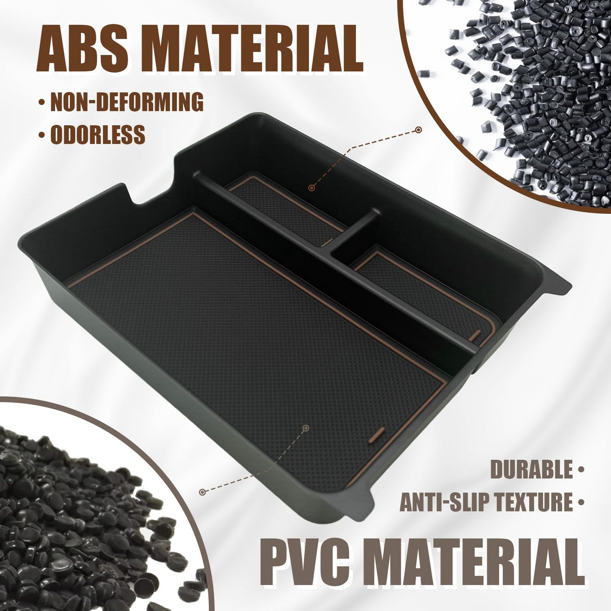 Q: What materials are used in the Muslogy Center Console Organizer?A: The organizer is made from high-quality ABS material, ensuring durability and wear-resistance. It also includes insert mats made of PVC material, which are odorless and waterproof.
