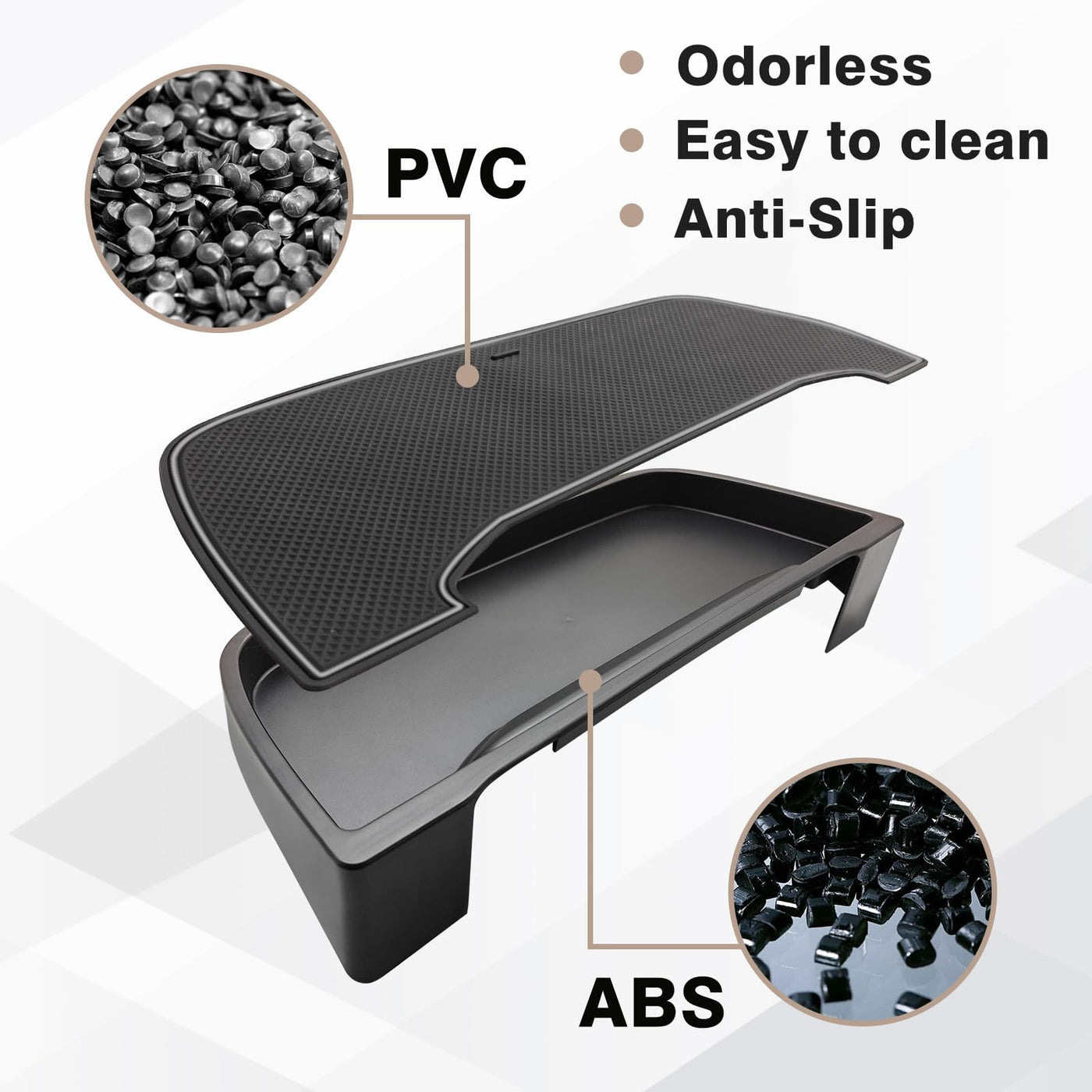 Q: What materials are used in the Muslogy Dash Storage Tray?A: The tray is made from high-quality Acrylonitrile Butadiene Styrene (ABS), which is known for its durability and resistance to wear. It also includes a PVC insert mat to keep your items secure and prevent sliding.