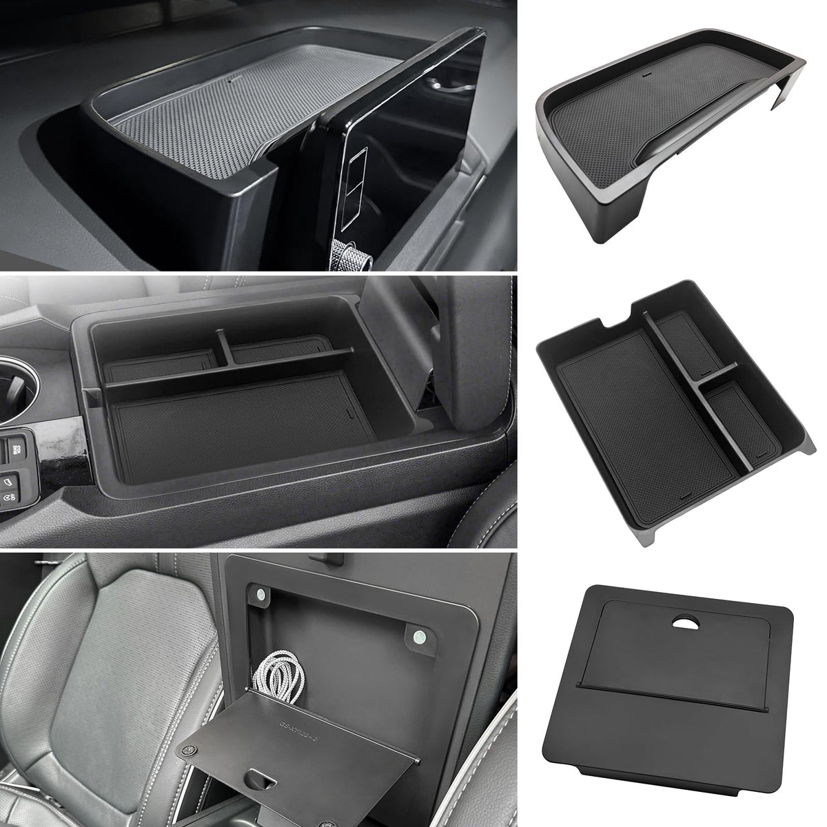 Q: What materials are used in the Muslogy storage tray set?A: The Muslogy storage tray set is made from premium ABS material, which is known for its durability and wear resistance. Additionally, the console and dash trays come with an odorless PVC insert mat that is easy to clean.