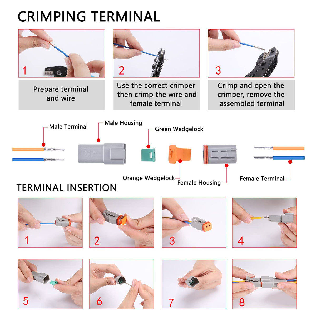 Manufacturer Name: DT IPD Housing Part Number: DT04-6P, DT06-6S Series: DT Series Material: Thermoplastic Operating Temperature: 14F (-10C) to +176F (+80C) IP Rating: IP67 Color: Gray Shape: Rectangular Insulation: .088''-.145'' Wire Gauge: 14-18 AWG Contact Size: 16 Current Rating: 13 Amps Continuous Each set include: 1 x DT04-6P 1 x DT06-6S 1 x W6P 1 x W6S 6 x Male Terminal 6 x Female Terminal Package include: 5 Kit 6 Pin Way DT Connector (DT04-6P+DT06-6S) DT DT Series connectors offer field proven reliability and rugged quality. The DT design strengths include optional flange mounting, multi-pin arrangements, lower cost, and design flexibility. The DT Series offers the designer the ability to use multiple size 16 contacts, each with 13 amp continuous capacity, within a single shell. DT electrical connectors will stand up to the harsh environmental challenges that are common to industrial markets that require advanced performance. Proper parts, procedures, and tooling must be used. Temperature Operating at temperatures from -10 C to +80 C continuous at rated current. Durability No electrical or mechanical defects after 100 cycles of engagement and disengagement. Insulation Resistance 1000 megohms minimum at 25 C. Moisture Resistance Properly wired and mated connections will withstand immersion under three feet of water without loss of electronic qualities or leakage. Dielectric Withstanding Voltage Current leakage less than 2 milliamps at 1500 VAC.