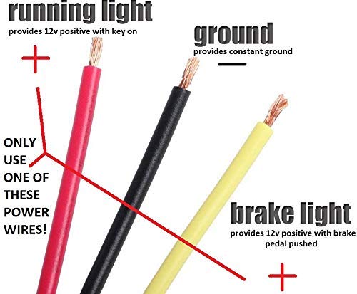Q: Can I use both power wires (red and yellow) at the same time?A: No, you only need to use one of the power wires. The red wire provides 12v power whenever the key is on, while the yellow wire provides power only when the brake pedal is pressed. You can cut off the unused wire and wrap it in electrical tape for safety.