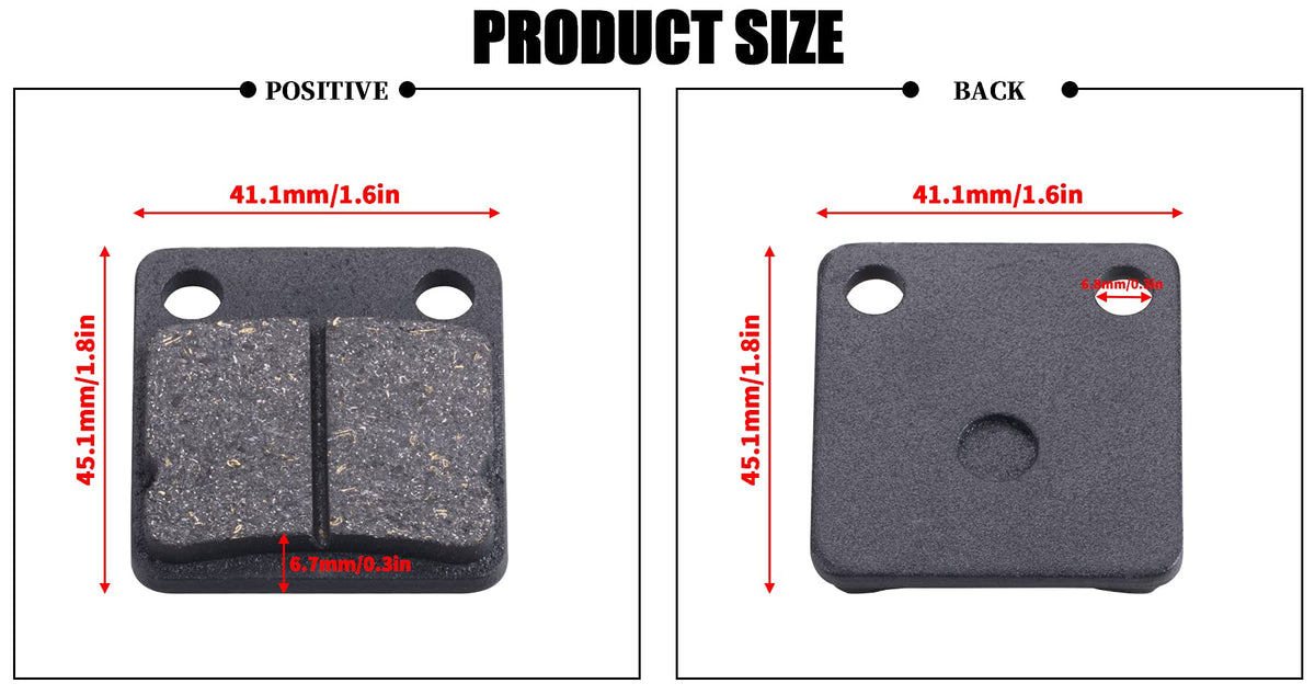Q: What are the dimensions of these brake pads?A: The dimensions of the MWMNUN Rear Disc Brake Shoes are approximately 4.5 cm in length and 4.1 cm in width, with a mounting hole spacing of 28mm.