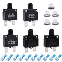 mxuteuk Circuit Breakers Push Button Manual Reset 125/250V AC 32V DC with Quick Connect Terminals and Waterproof Button Caps Features: - Current Rating: 3A,5A,10A,15A,20A - Operating Voltage: 125/250V AC 32V DC - Terminals: 2 Pin - Switch Type: Push-button Reset Product Description: Color:Black It mounts in 3/8 inch (10 mm) round hole. This replacement circuit reset circuit breaker can be used in a variety of applications requiring up to 3 amp protection. Package include: 1 x 3A Circuit Breaker 1X 5A Circuit Breaker 1 x 10A Circuit Breaker 1 x 15A Circuit Breaker 1 x 20A Circuit Breaker 5 x waterproof button cap 10 x Quick Connect Terminal