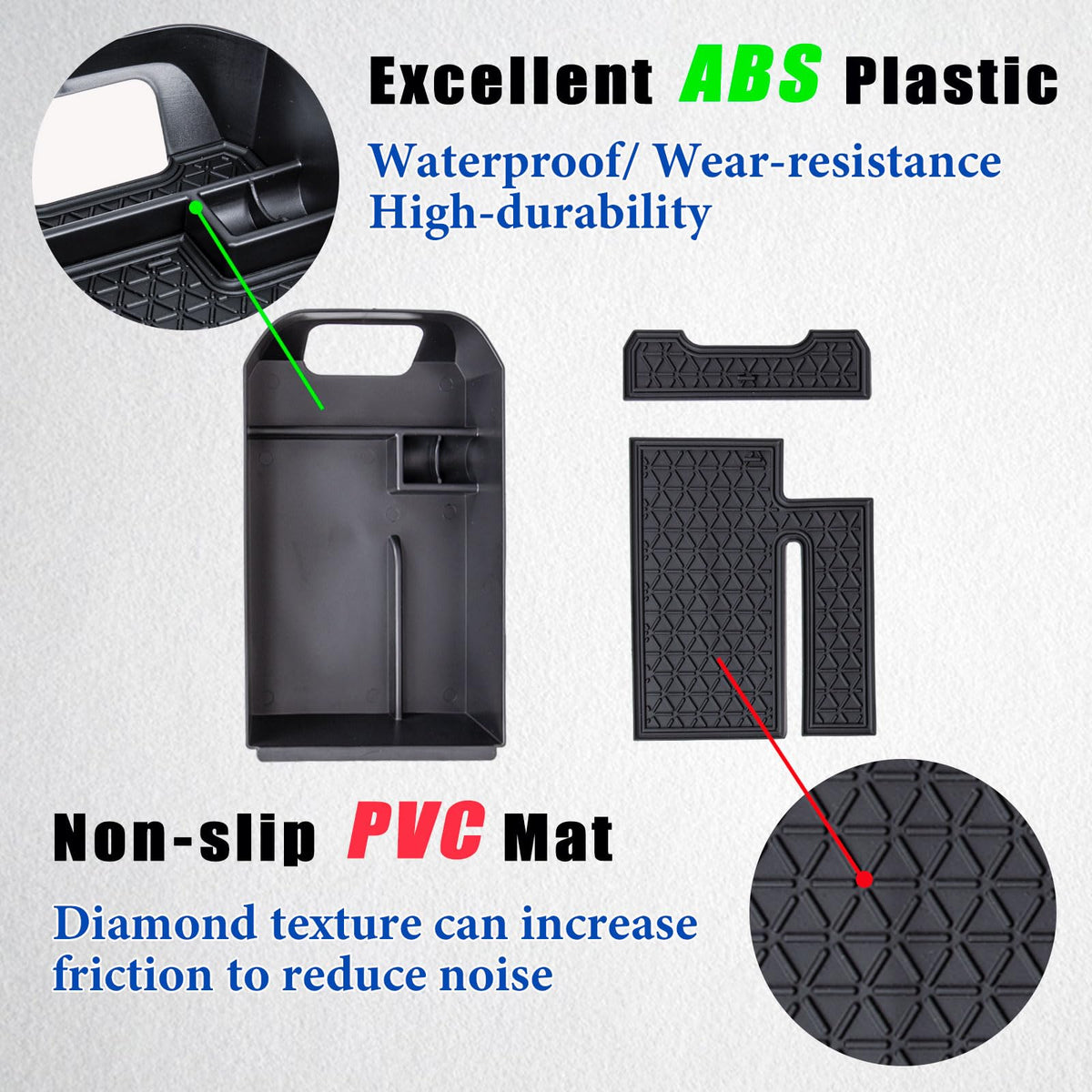 Q: How does the non-skid pad work in the organizer tray?A: The non-skid rubber pad prevents items from sliding or making noise during driving, ensuring that your belongings stay securely in place.