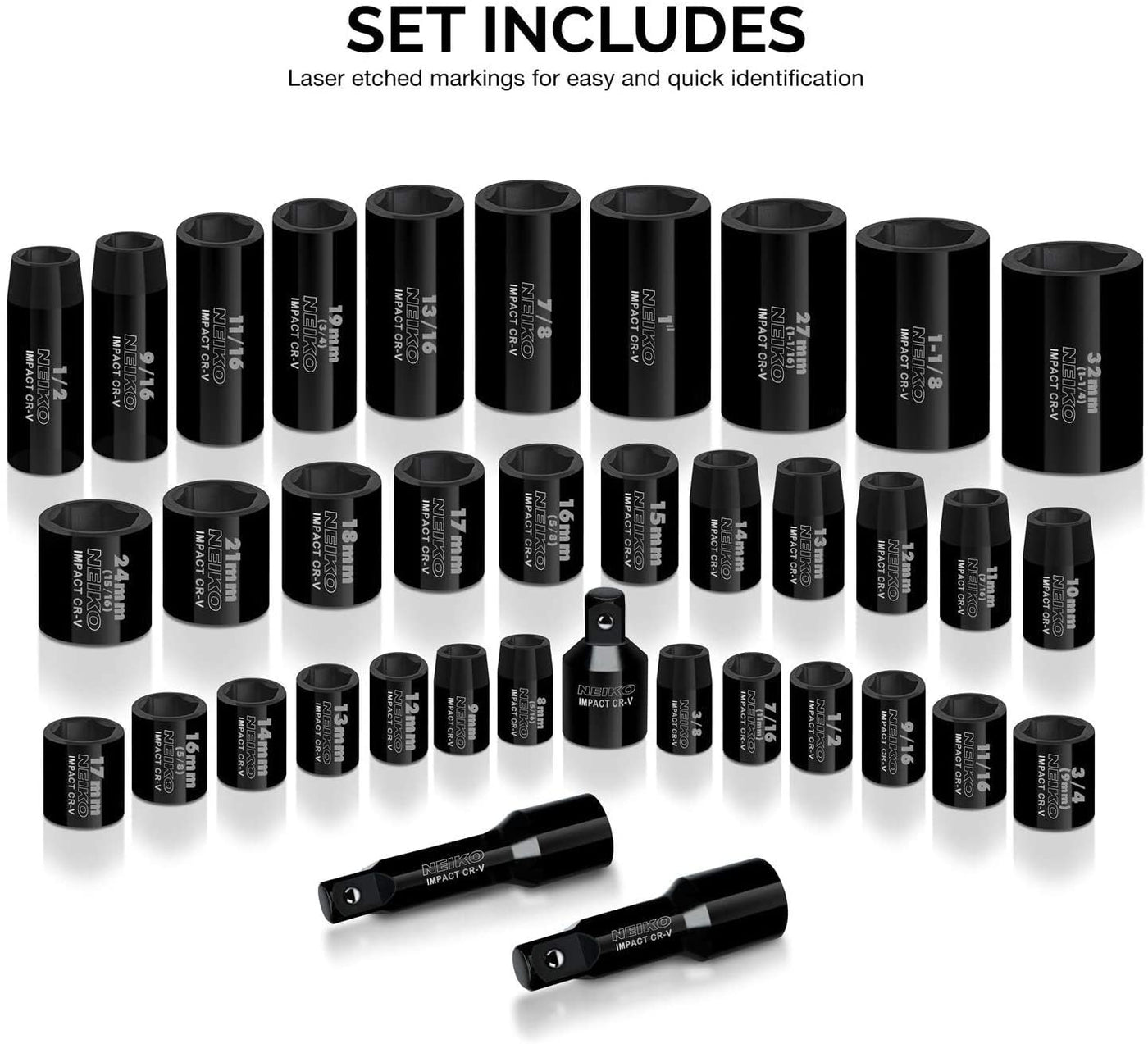 NEIKO 02443A 3/8' and 1/2' Drive Master Impact Socket Set | 38 Piece | Standard SAE (Inch) and Metric (mm) Sizes Below | Deep and Shallow Kit | Cr-V Steel | Includes Duometric Sockets