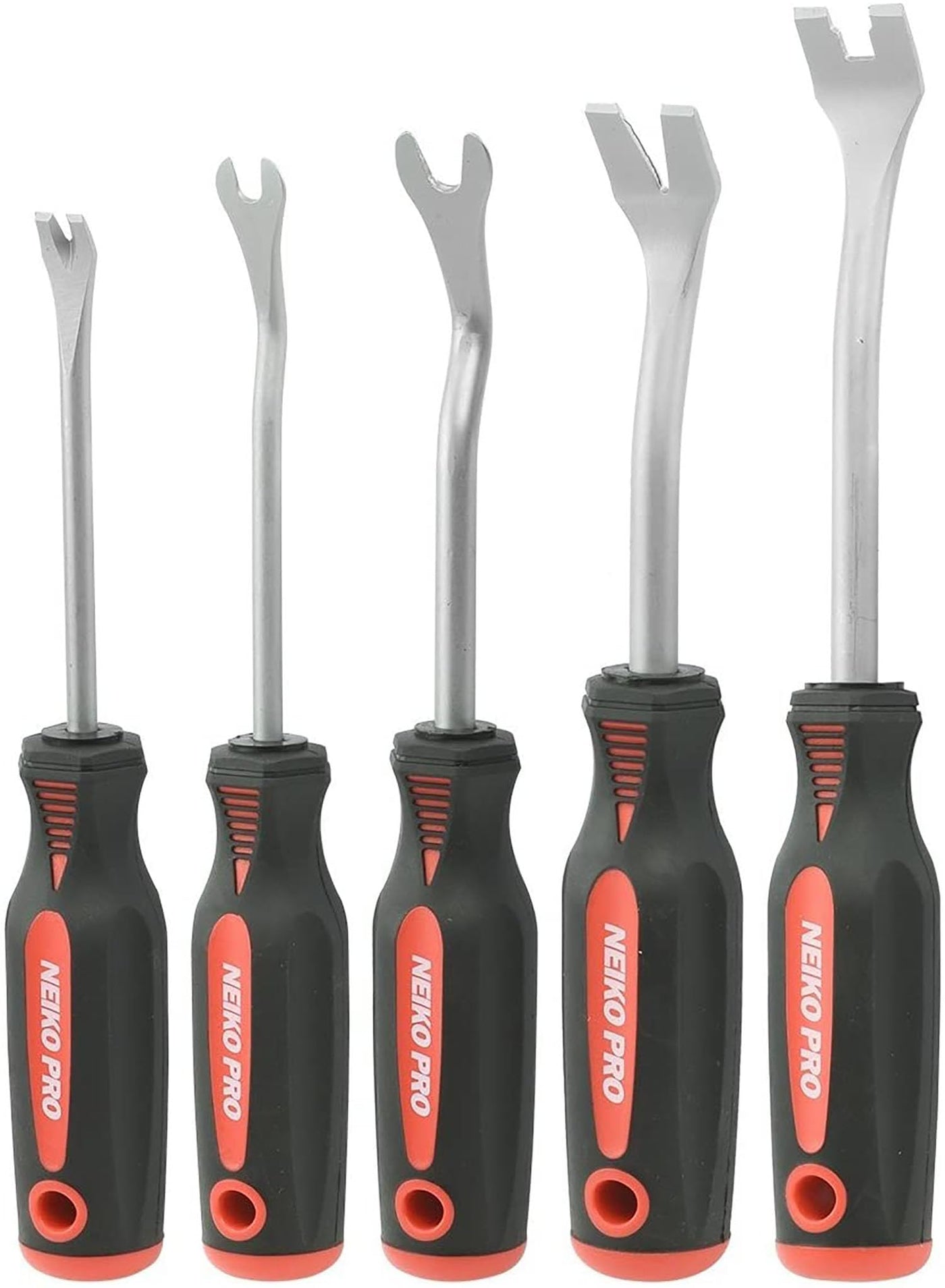 The Neiko 20596B Auto-Upholstery Removal Tool Set Gives You Extra Safety And Precision When You Need To Remove Car Fasteners And Clips That Secure Upholstery, Panels, And More. Each Shaft Is Made From Durable Svcm Satin Chrome-Plated Steel To Last Through Many Mechanic Projects. These Quality Tools Feature Pivot Points For Appropriate Leverage, Preventing Twisting That Can Damage Door Panels And Trim. This Gear Is Also Equipped With Black Ergonomically Shaped Soft-Grip Handles For Extra Comfort During Your Auto-Body Sessions.Perfect For Use On Most Domestic And Import Vehicles, Our Auto Tools Are Great For Interior Work, Such As On Dashboards, Consoles, Stereos, And Radios. Our Trim-Removal Tool Kit Is Also Ideal For Home Use, Hobby Or Diy Projects, And Jobsite Use. Its A Beneficial Accessory For Any Car Tool Set And Makes A Great Gift For Mechanics.This 5-Piece Set Includes A Wide Variety Of Tool Sizes To Best Handle Your Fastener Needs. It Includes 1 Square-Notch Tip, 1 Large V -Notch Tip, 1 Small V -Notch Tip, One 1/4-Inch U -Notch Tip, And One 5/16-Inch U -Notch Tip. When It Comes To Fasteners, Neiko Has Your Back With Our Durable, Dependable, And Strong Tools.