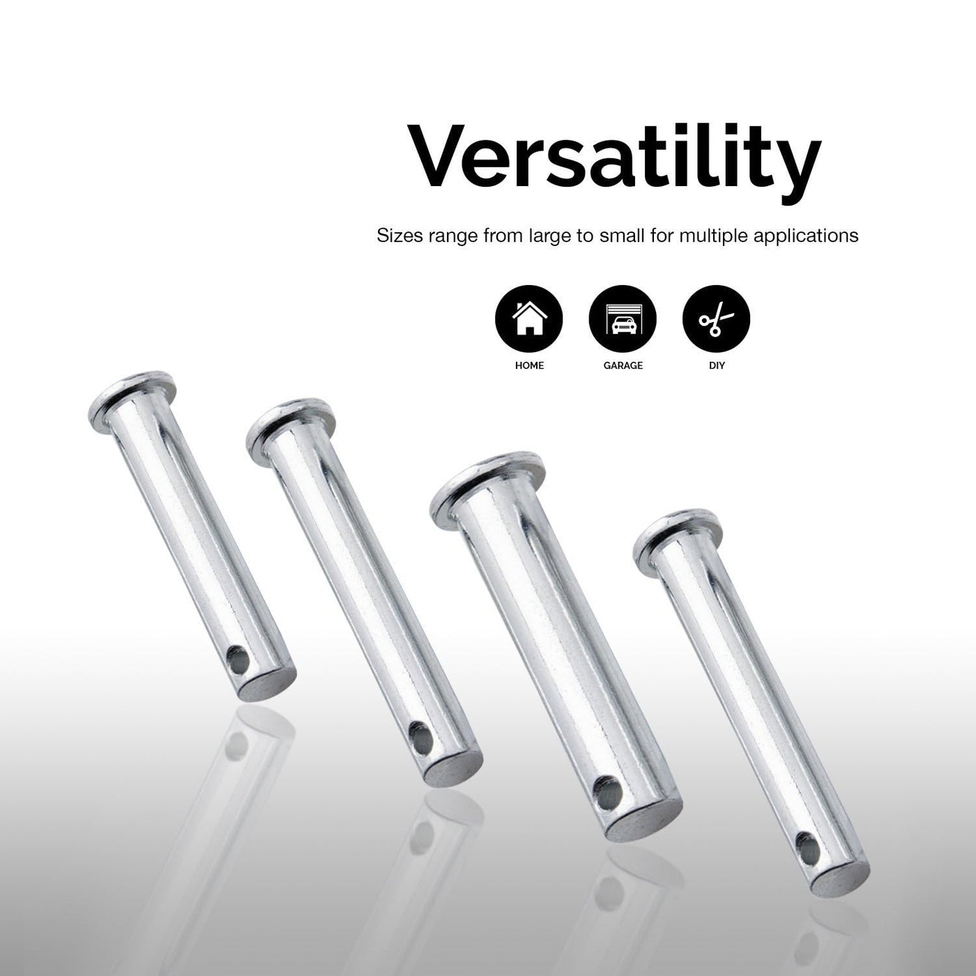Clevis pins make a great tool addition for any small and general projects around the home. With this assorted set of Clevis pins, You no longer have to buy individual pins and worry about getting the right size and length. An important part to the clevis fastener system, The clevis pin works together with cotter pins (not included) to allow absorption of Lateral stress and provides free rotational movement of the supported object. With the high versatility of these pins, You can utilize them as fasteners that can securely fasten objects together and allow them to have freedom of movement. This set includes a wide variety of (SAE) Clevis pins for all your fastening needs around the home. The set comes with 3 hole sizes: 3/32'-hole (4-3/1 X1', 4-1/4 x 1', 3-D/4x1-1/4', 4-1/4x1-1/2', 3-D/4x1-3/4', 3-D/4x2', 3-1/4x2-1/4', 3-D/4x2-1/2), 1/8-hole (3-5/16 X1', 3- 5/16 x 1-1/4', 4- 5/16 x1-1/2', 3-5/16x1-3/4', 2-5/16x2', 2-5/16 x2-1/4', 1-5/16x2-1/2', 2-5/16x2-3/4'), 5/32'-hole (4 - 3/8 x 1', 3 - 3/8 x 1-1/2', 2 - 3/8 x 2', 2 - 1/2 x 1-1/2')