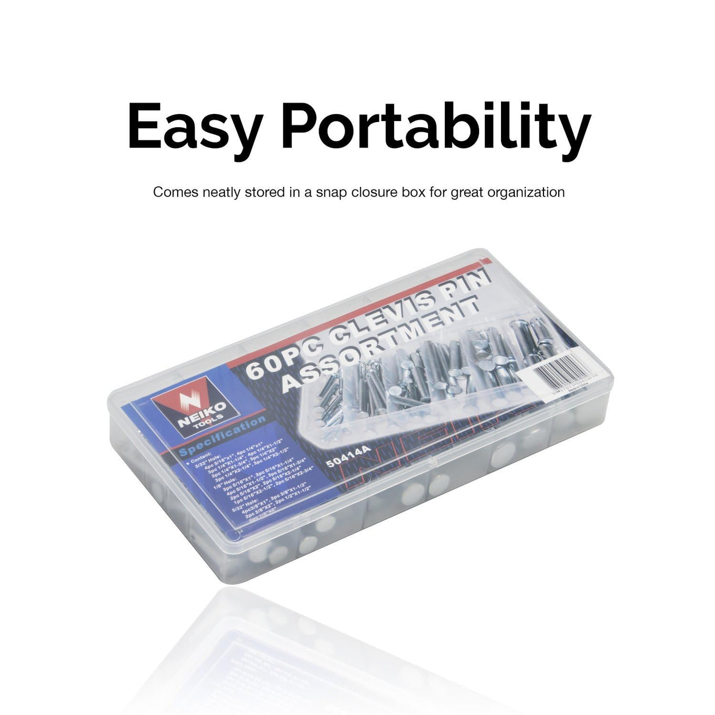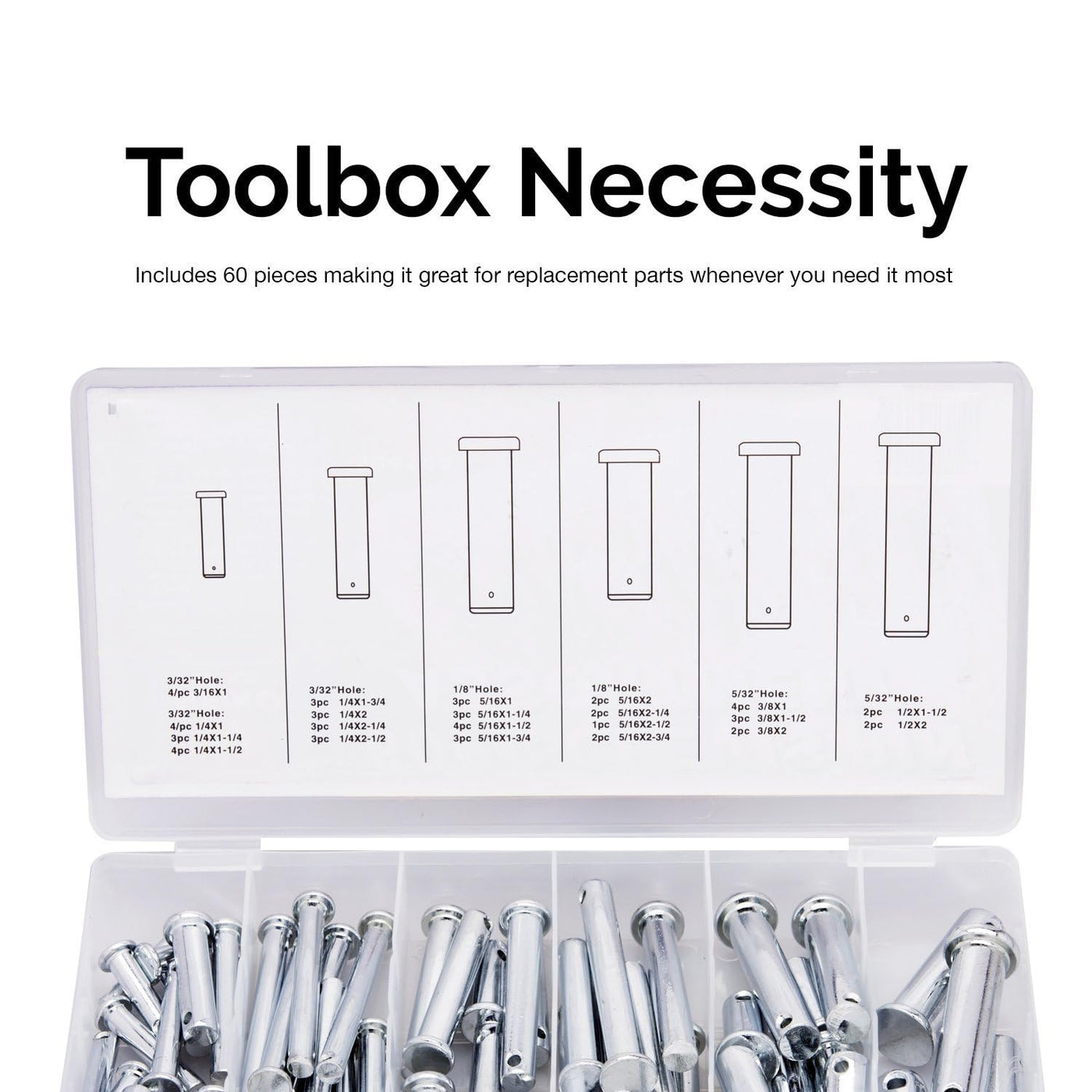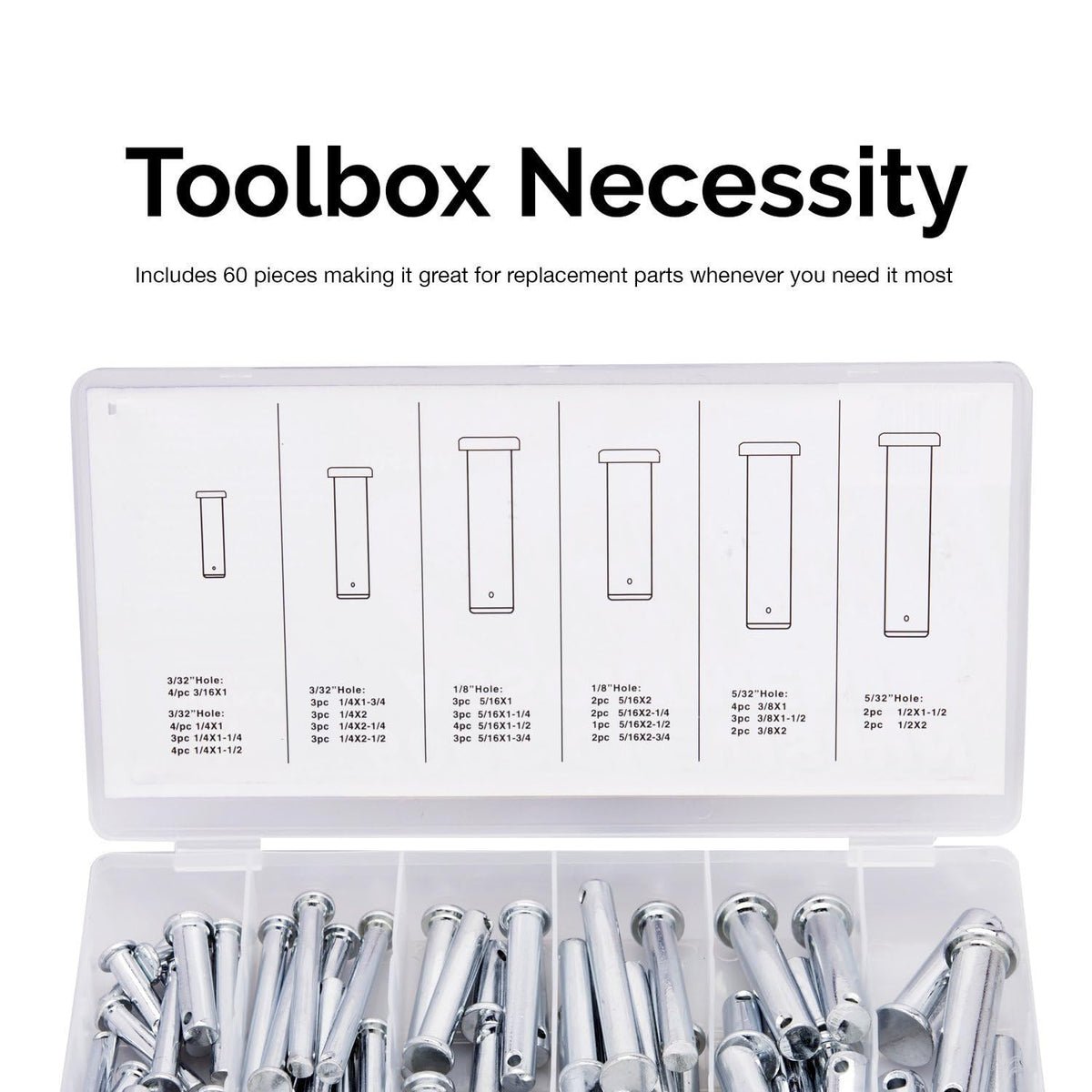 NEIKO 50414A 60 Piece Clevis Pins Assortment Kit, Zinc Construction 3/32”,1/8”, and 5/32” Hole Sizes, 3 Different SAE Sizes, Steel Pin, Single Hole Flat Head Clevis Pins