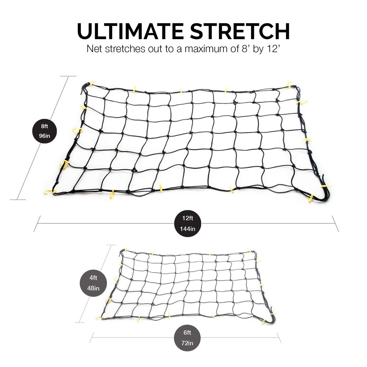 Q: What are the dimensions of the NEIKO 50971A Cargo Net?A: The NEIKO 50971A Cargo Net measures 4 feet by 6 feet but can expand up to 8 feet by 12 feet, making it versatile for various cargo sizes.