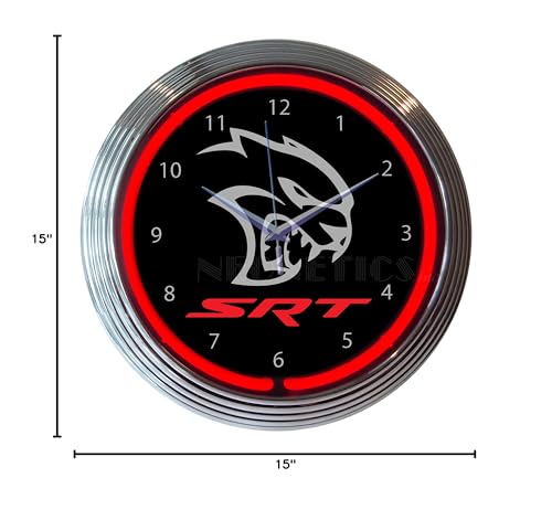 Q: How does the neon lighting work on the clock?A: The neon lighting on the Neonetics Dodge Hellcat SRT Neon Clock features a hand-blown ring of real glass neon, which generates 25 watts of light, creating a vibrant and eye-catching glow.
