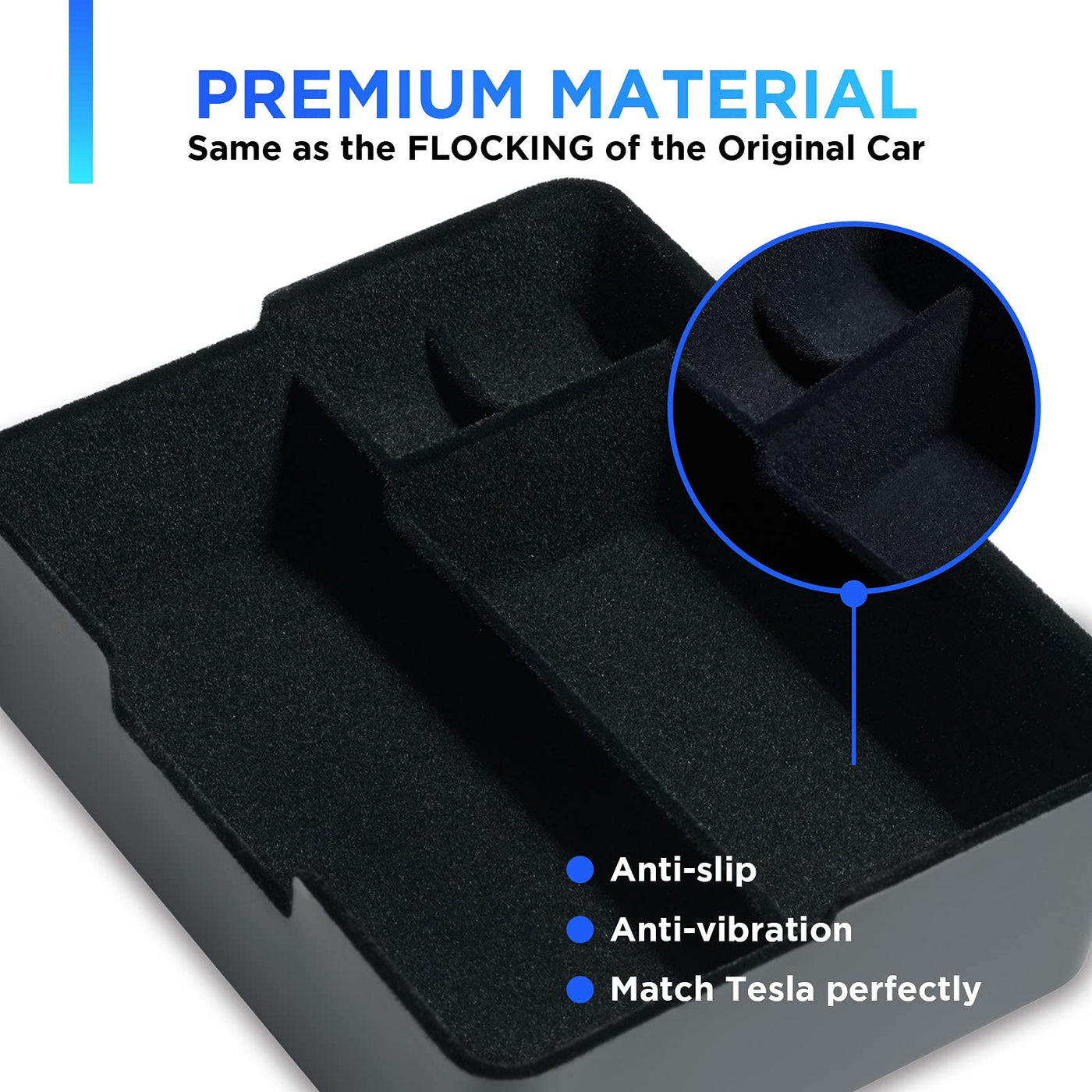 Q: What materials are used in the Nestour Center Console Organizer?A: This center console organizer is made from premium ABS and flocking material, providing anti-slip and anti-vibration properties that match the original Tesla interior perfectly.