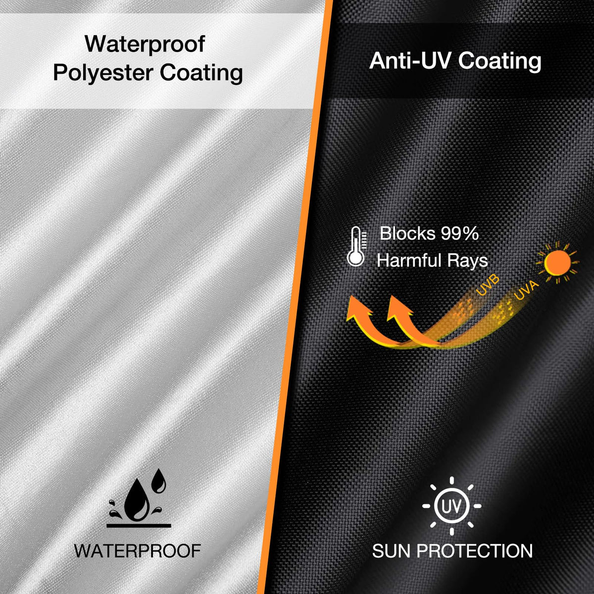??Material?NEVERLAND ATV Cover use the Polyester Taffeta fabric, which is more anti-ultraviolet, weather-resistant, tear-resistant and wear-resistant. The cover wrap your ATV quad bike from top to the bottom coverage, protect your ATV against dust, rain, heat, tree sap, damaging UV rays & inclement weather | ??Waterproof Quad Cover?Our outdoor cover with rainproof fabric and waterproof PU coating (silvering), better waterproof performance. Neverland ATV Cover can completely resolve the problem of water seepage of other similar products. Your ATV will perfectly keep dry in all weather all seasons | ??Fine Workmanship?1?? Four handle reflective strips, portably and greatly enhance the safety for parking at night; 2?? ATV Cover with adjustable bandage, windproof buckle and elastic band for stronger windproof ability; 3??Front indicative mark on the ATV Covers for quick installation; 4??Two-thread stitching on the heavy duty, longer service life and better waterproof performance | ??2 Faces Usable? Reversible design, different usage for the front and rear surface: silver face up for summer with it’s ultraviolet-proof silver layer, and the opposite side (black face up) for winter with stronger heat absorbtion to against quad cover frozen and for easier notice in snow days | ?Easy for Storage? Waterproof heavy duty 4 wheeler covers outdoor storage cover comes with portable bag, easier for storage, you can take the ATV cover wherever you want. The waterproof ATV cover Size XXXL is (100.79" × 43.31" × 47.24"), please check the size data carefully before you purchase, If you have any questions about size, just feel free to contact us