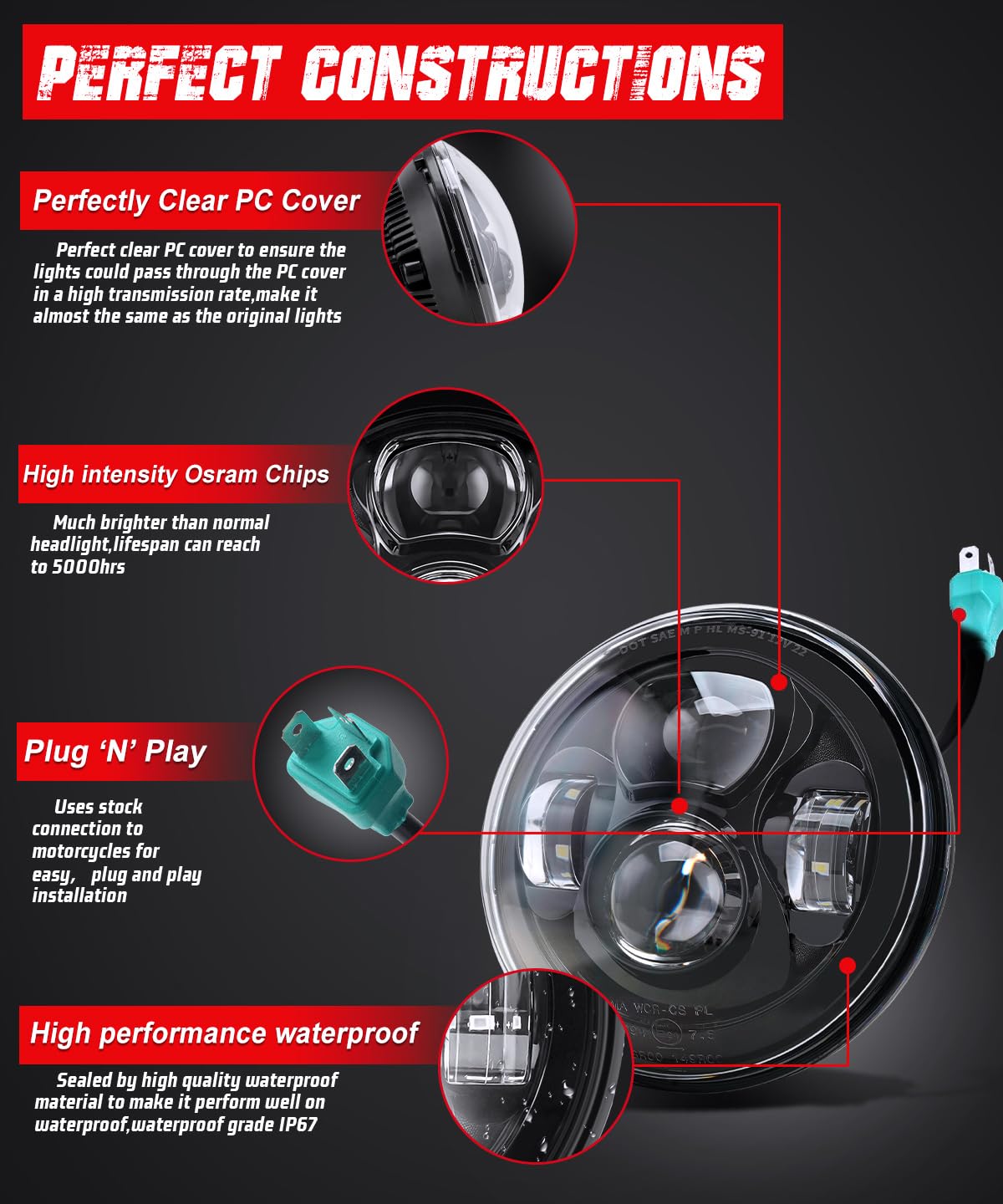 Exceptional Fitment: Our 7-inch LED headlight kit is designed to seamlessly fit most Harley-Davidson Motorcycles equipped with a 7-inch stock headlamp and 4-1/2 inch passing lamps, including models like Road King, Street Glide, Ultra Classic, Electra Glide, Heritage Softail, Softail Deluxe, Softail Slim, Fatboy, Switchback, Ultra Limited, Tri, and CVO from 1989 to 2019. | Effortless Installation: Experience true plug-and-play installation with all the necessary mounting hardware included. We provide a ''7-inch Headlight Mounting Ring'' for secure fixation on Switchback, Road King, Street Glide, Electra Glide, and Ultra Limited models; an ''H4 to H9 Y-Adapter'' for 2014 to 2022 Street Glide Special and Road King Special; and a ''4-pin Headlamp Wire Harness'' for 2014 to 2022 Street Glide, Electra Glide, Tri Glide, and Ultra Limited models. | 2024 Upgraded Optic Headlight: Revel in the brilliance of our super-bright 6500K advanced LEDs, boasting an impressive 84W output at 5000 lumens for high beam, 54W at 3000 lumens for low beam, and a 54W, 2600-lumen driving light. This all-in-one projector headlight is five times brighter than stock halogen bulbs, delivering an even light pattern with no glare, blinding areas, or dim spots. Crafted for durability, it adds a modern cool look while being corrosion-resistant and dustproof. | Stable Illumination, Enhanced Safety: Our 7-inch LED motorcycle headlight with DOT SAE approved,offers a wider and more focused lighting projection distance with a sharp cut-off line. It significantly improves overall visibility during long rides, ensuring better vision and road reflections for enhanced nighttime safety. | Waterproof Design, Robust Build: Designed with IP67 waterproofing, this 7-inch LED headlight features double breather valves to prevent rain and mist from entering the assembly. The solid, heavy-duty aluminum base housing offers excellent impact resistance and reduced vibration. Its anti-scratch lens provides maximum protection from gravel and minor abrasions, and the thick heat sinks ensure efficient cooling, extending the lifespan up to 50,000 hours. | Committed After-Sales Support: Tugwuetlwu stands by its products, offering a 30-day return policy and a 1-year warrant for quality issues with our 7-inch motorcycle headlight. Should you have any questions or concerns, please do not hesitate to contact Tugwuetlwu. We will respond promptly within 24 hours.