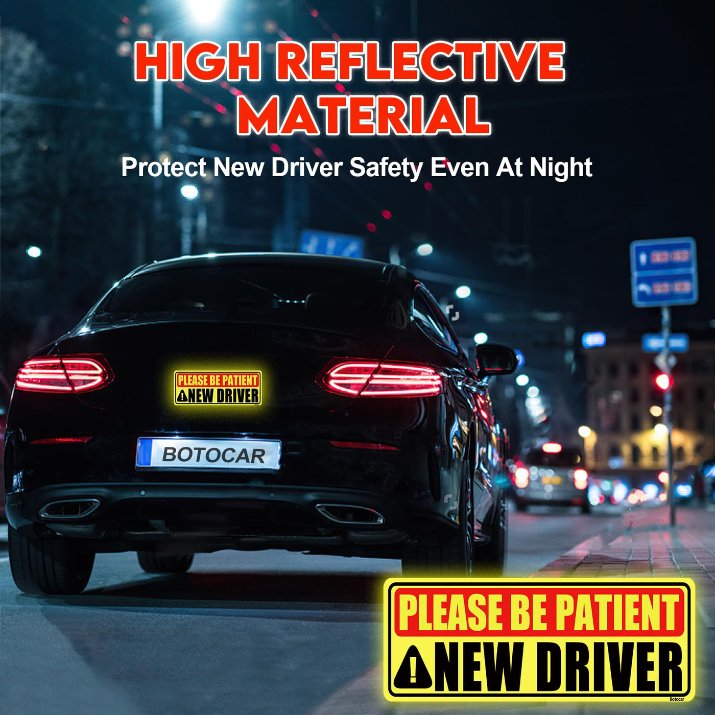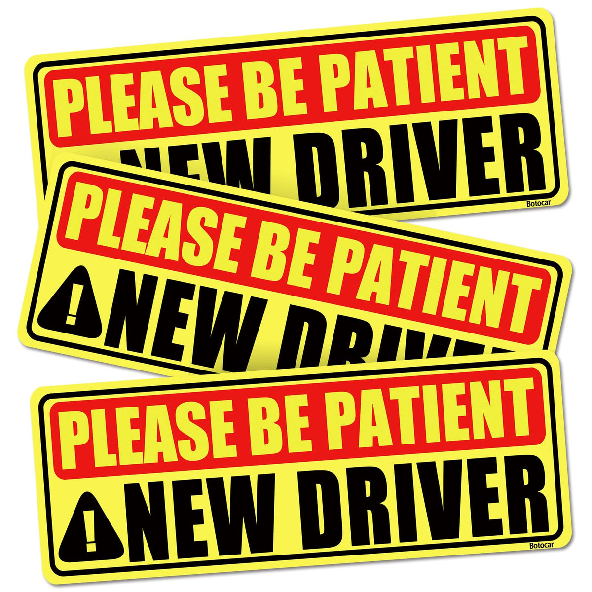 EXCLUSIVE DESIGN & RESPECT COPYRIGHT & REFUSE PIRACY: Botocar is the first to design this style new driver magnet for car, idea is from Marrvell. Made of strong magnet and high reflective material, is the special style in the market, please support genuine, reject piracy! LARGE TEXT &BIG COLOR DIFFERENCE - Other new driver magnet only adopt yellow background with black text. Ours are BLACK large text, bright YELLOW&RED background, which makes the BIG color difference to attract people's attention greatly. STRONG MAGNET & HIGH REFLECTIVITY: Made of top-quality strong magnet, which has more sturdy. We have tested to stay secure at over 120 MPH. Diamond-grade reflective material provides the highest visibility between day and night even a long distance! Safety is everything! ALLEVIATE THE STRESS FOR BEGINNER - Our please be patient new driver magnet can reduce new driver's level of nervousness. Once other realize you are learning to drive, then they will give you more space and respect, control car whistle. REMOVABLE AND REUSABLE - Compared to new driver bumper sticker/decals, is easily removable to other vehicle, and is no fading for long time. NOTICE: Magnetic new Driver can strongly stick to the car rear which is made of metal. NOT Aluminum or other Plastic.