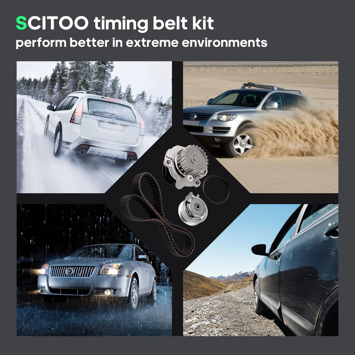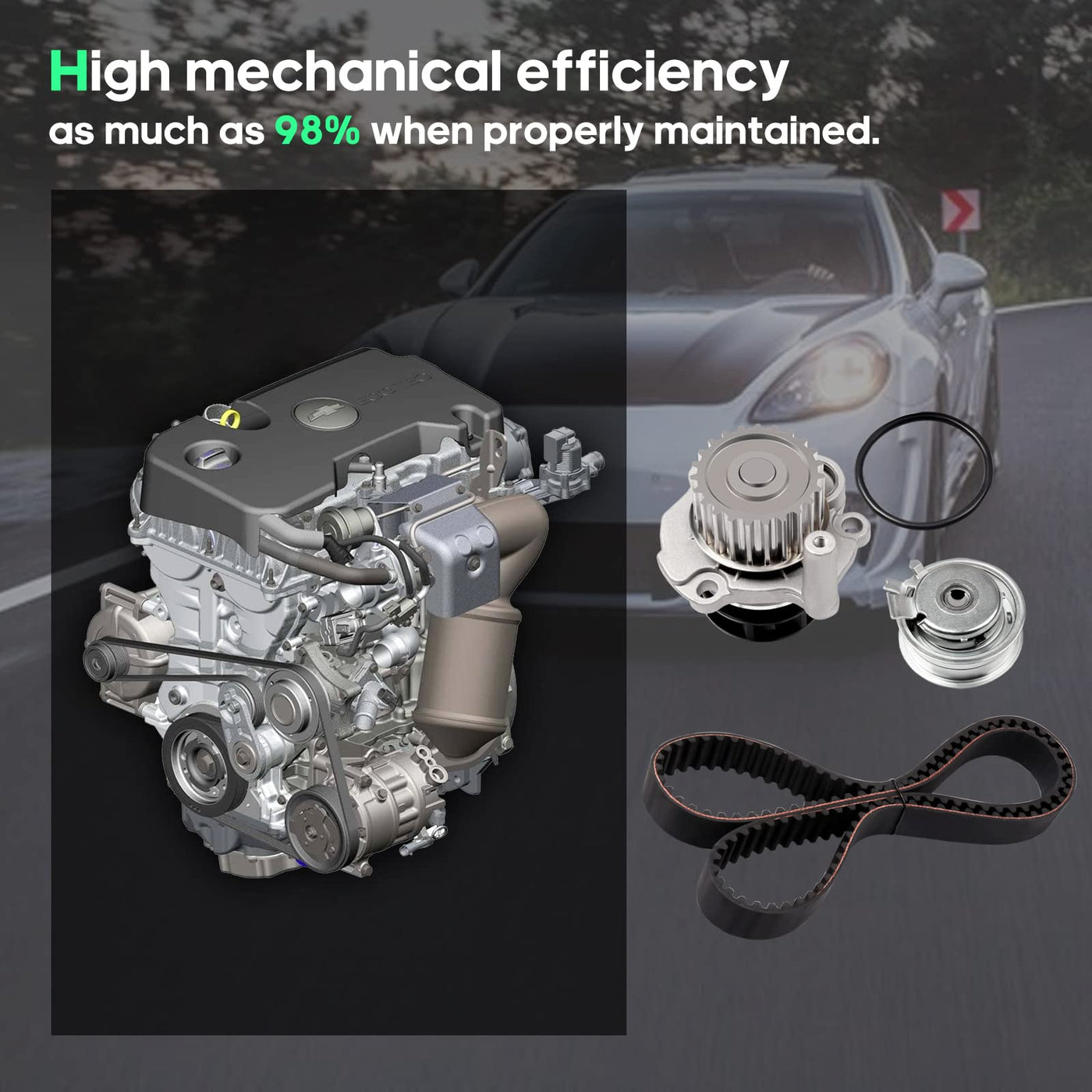 Q: What does the Timing Belt Water Pump Tensioner Kit include?A: The kit includes one timing belt (138 teeth), one tensioner (bearing assembly), and one water pump with a seal, providing all the essential components needed for a complete installation.