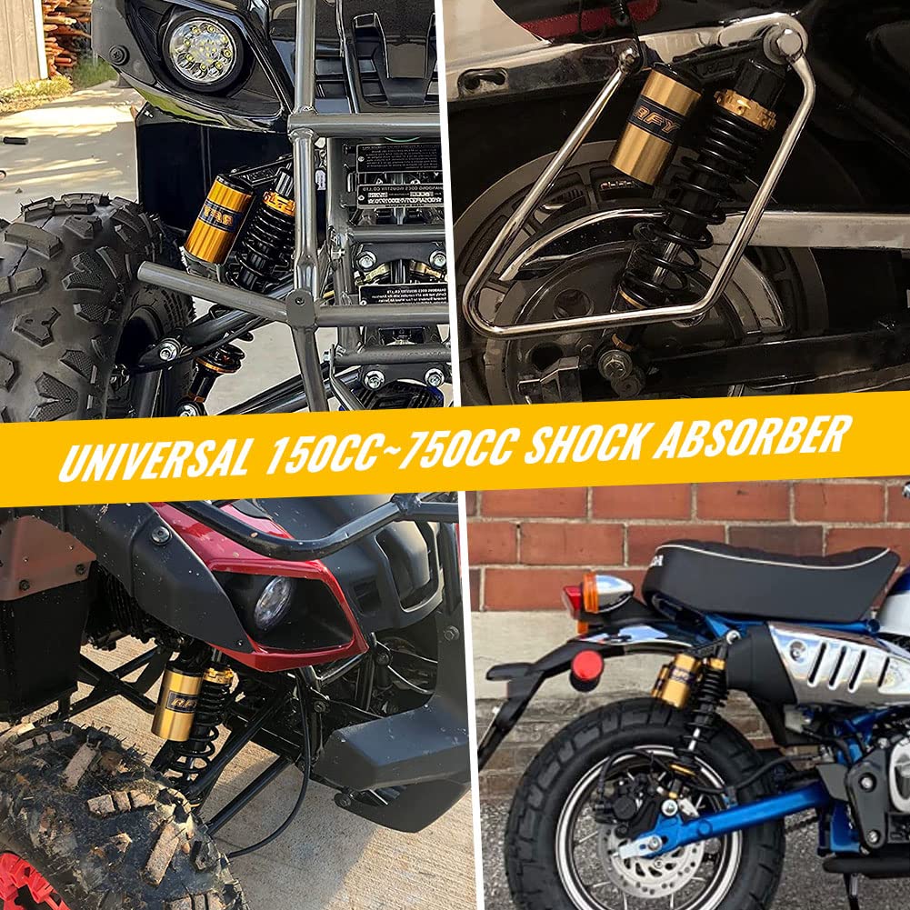 Newsmarts 2pcs 12.5 320mm Air Shock Absorbers Rear Nitrogen Suspension Universal Fit for HONDA for Yamaha ATV Go Kart Quad Dirt Sport Bikes, Gold and Black Condition: Brand new Color: Gold and Black Material: Solid Steel + Aluminium Alloy+ Rubber Installation Type: Eye to Eye Fitment: Universal Fit. Work perfectly on most 150cc~750cc street bikes, Scooters and Moped Quad (ATV) with shocks of 320mm eye to eye distance. Great choice for replacement, style upgrading and all kinds of bike modification. Dimension: Total Length: 350mm (13 3/4'') Length of Eye to Eye Core: 320mm (12 5/8'') Eye Diameter(with bushing): 12mm Eye Diameter(with bushing removed): 16mm Eye Thickness: 21mm Eye Maximum Tensile Strength: 2,000 Kgf Spring Thickness: 7mm Spring Width: 60mm Working Stroke: 60mm Spring Stiffness: 110 kg Maximum load: 200 kg (440 lbs) Air Reservoir: Adjustable Factory Air Pressure: 0.4 Mpa Maximum Air Pressure: 0.5 Mpa Fitting manual is not included. Instalby qualified mechanic is recommended. Packaged Included: 1 Pair Shock Absorbers