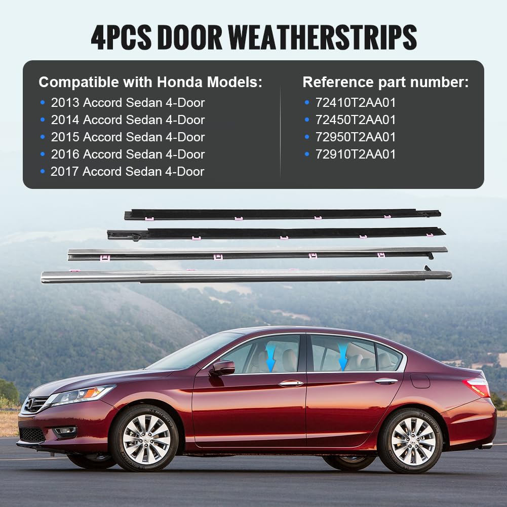 Fitment: Fit for 2013- 2017 Accord (Please double check your vehicle model is exactly same as us .) Specifications: Condition: Brand New OE Number: 72410T2AA01, 72450T2AA01, 72950T2AA01, 72910T2AA01 Color: Chrome Package Included: 4pcs Weatherstrips
