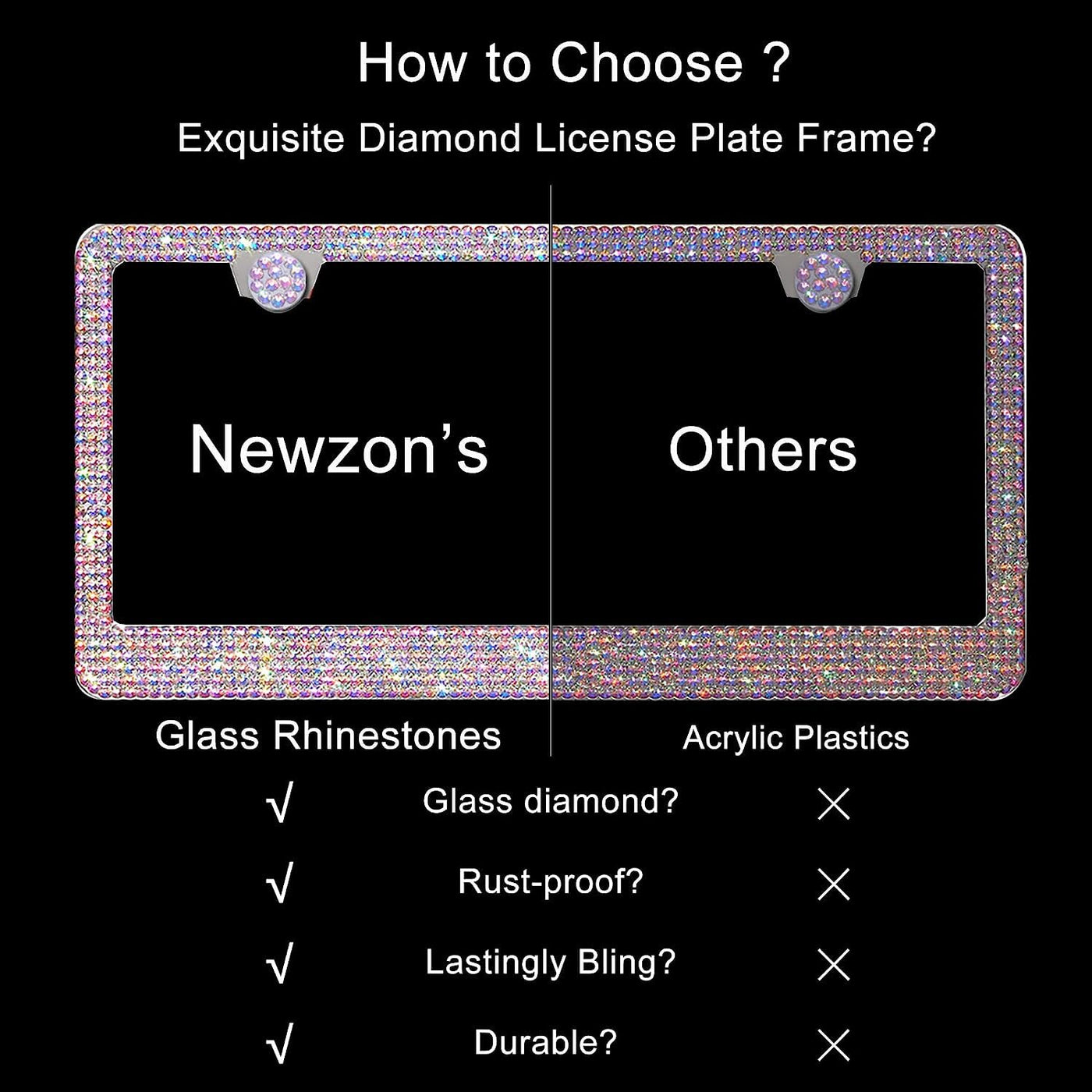 Q: Are the rhinestones on the license plate frame durable?A: Yes, the rhinestones are applied with super waterproof glue, ensuring they remain secure even through car washes and various weather conditions.