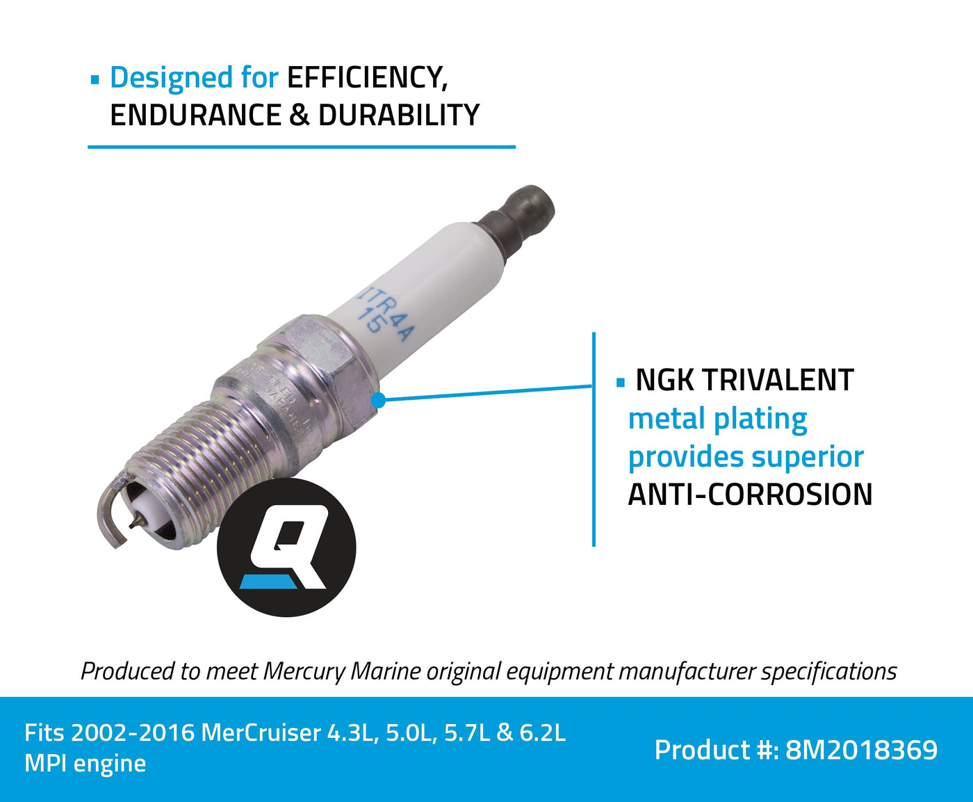 The ITR4A-15 spark plugs come pre-gapped as specified by your engine manufacturer. Use only the spark plug listed in your engine owners manual. Using the wrong plug can reducing optimum performance, reduce fuel economy or cause damage to your engine. Spark plugs are easy to change with common spark plug sockets. The NGK pure alumina silicate ceramic insulator provides superior strength, reduces breakage and better heat transfer. The Ribbed Suppressor Seal extends resistance and prevents spark flash over and misfire. The Quicksilver brand is the leader in delivering uncompromising engine oils, parts and accessories to the marine industry for over 65 years. Quicksilver is the premier supplier of Mercury Marine Original Equipment replacement engine parts, oils, and accessories, but also works to serve all Original Equipment brands in the marine and powersports industries. It has earned a loyal following by providing the highest quality products that are tested through some of the most rigorous environments and testing procedures. No aftermarket company comes close to the level of research and design as Quicksilver; buying Quicksilver is buying performance, protection and peace of mind.