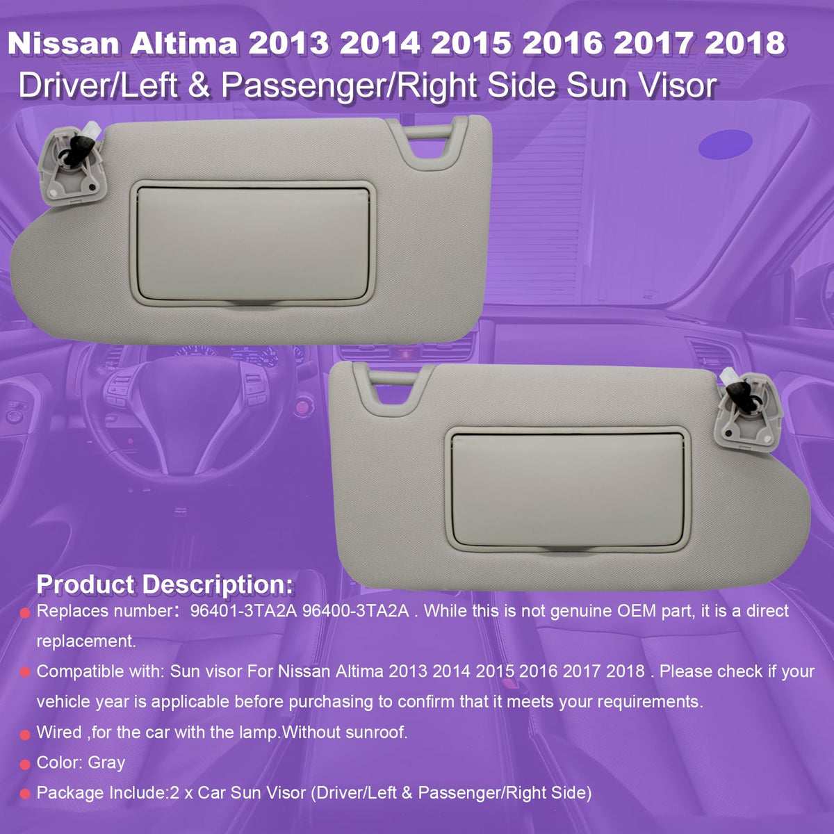 Compatible with:Sun visor For Nissan Altima 2013 2014 2015 2016 2017 2018 . Please check if your vehicle year is applicable before purchasing to confirm that it meets your requirements.
