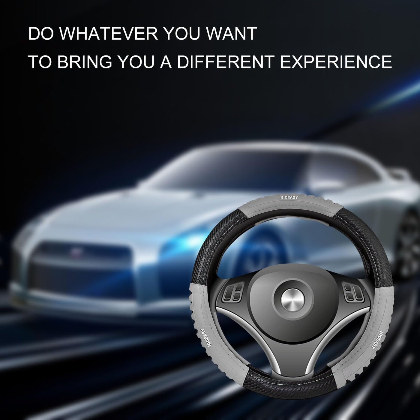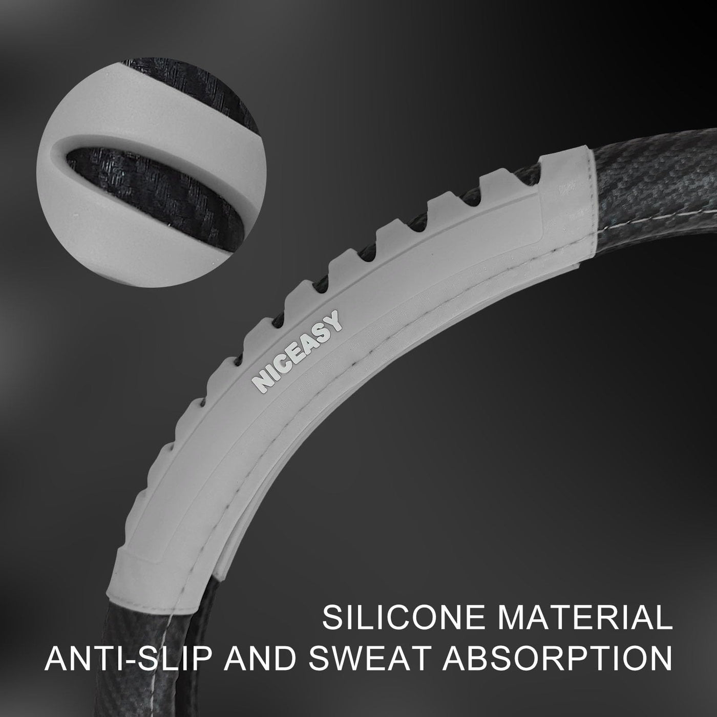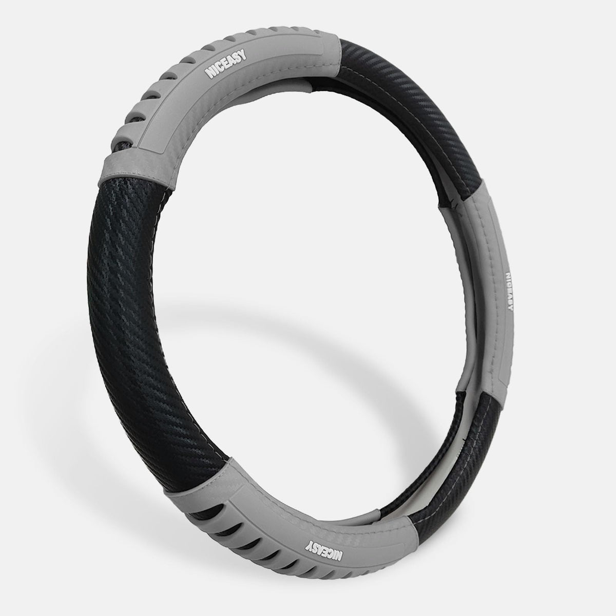 NICEASY Sport Style Black Carbon-Fiber Steering Wheel Cover with Grey Grip Steering Wheel Accessory,Universal Fit 14.75-15 inch