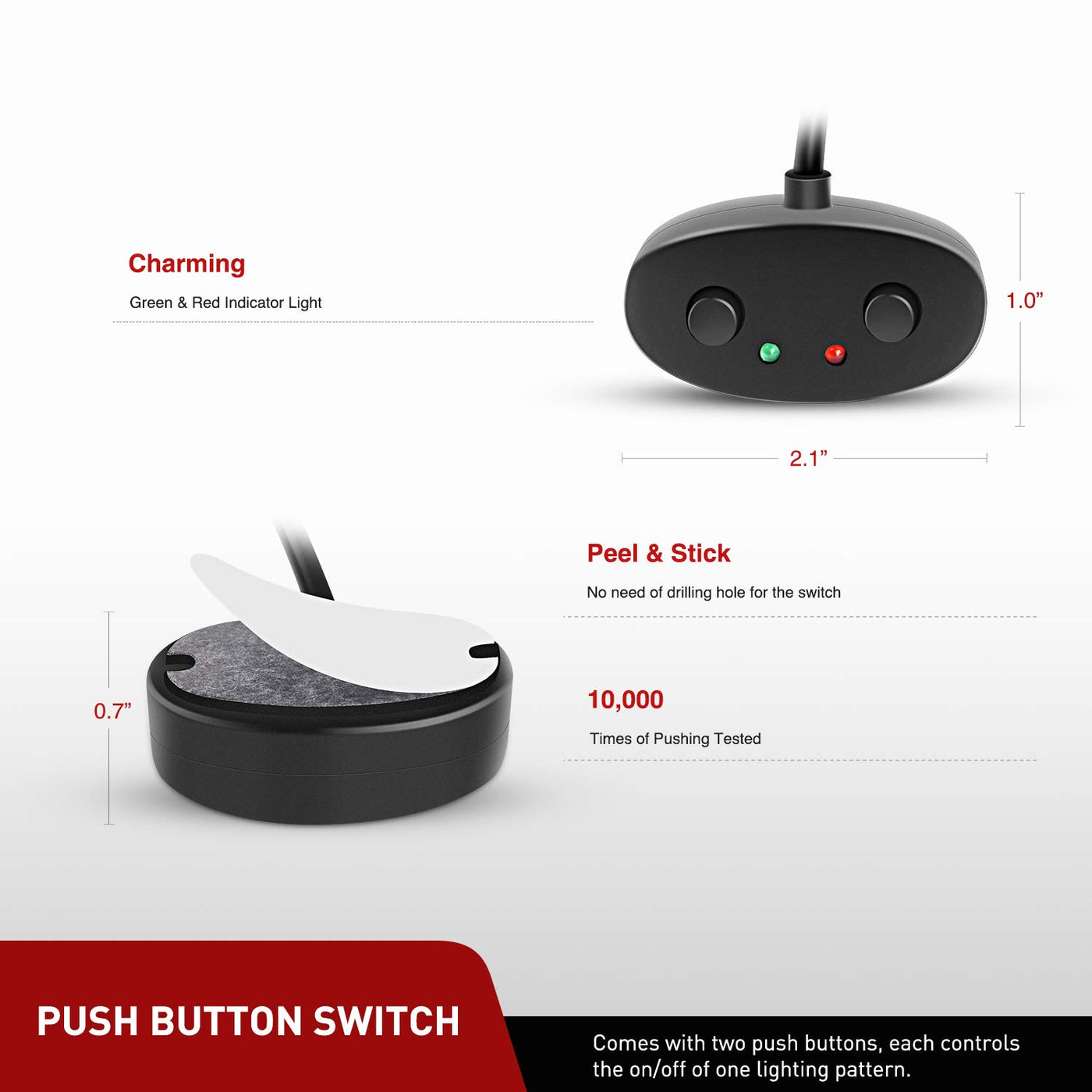 Dual Color Light Control: Upgrade design for amber & white dual color light bar. You can freely opt to use single white driving light, single amber fog light, or white light amber light together. | High Protection: Comes with two 15A inline blade fuse and two relay to keep protecting the all circuit from overcurrent and short circuit. Makes it always be safe. | Two Leads Available: The wiring harness has two leads available, allowing you to connect two light fixtures. Wire length from power to first lead and second lead is 8. 5ft and 11ft. | Push Button Switch: Easy installed push button with adhesive tape, no worries of drilling hole. Green indicator light button controls the on/off of amber light, red indicator light button controls the white driving light. | Applicable for dual color light bar on 12V vehicles such as Jeep, truck, ATV, UTV Subaru, motorcycle etc. Package Include: 1 x Wiring harness kit, 1 x Accessory pack, 1 x Instructions Manual, 2 Years Warranty Honored by Nilight
