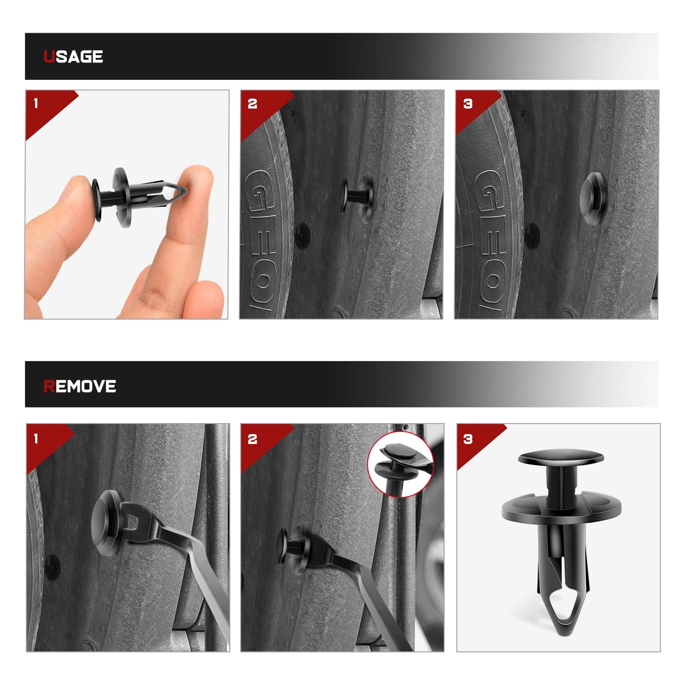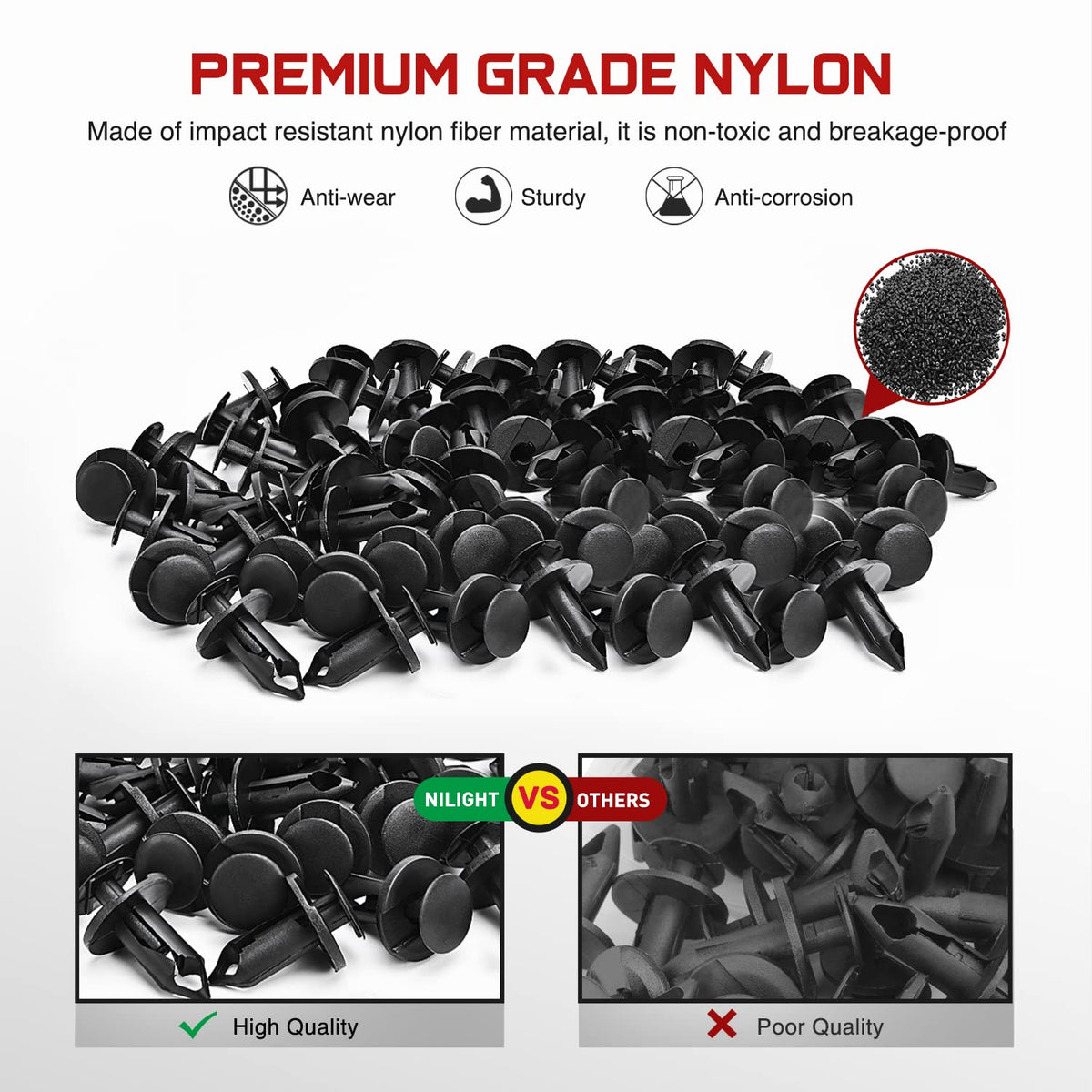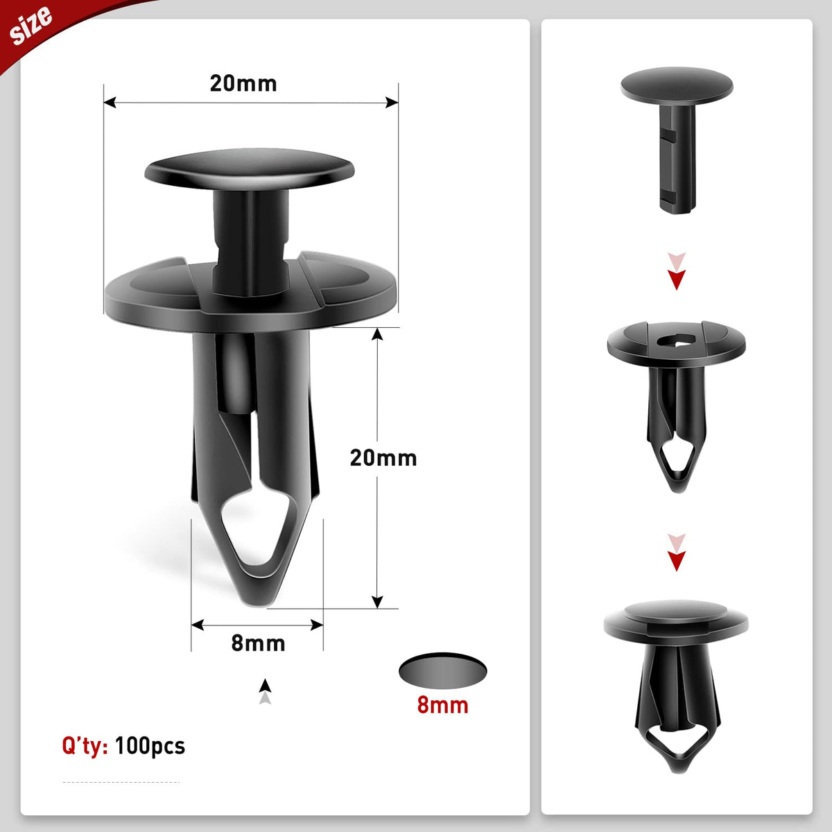 Q: How many clips are included in the package?A: The package includes a total of 100 nylon fastener rivet clips, providing ample supply for multiple repairs or installations.