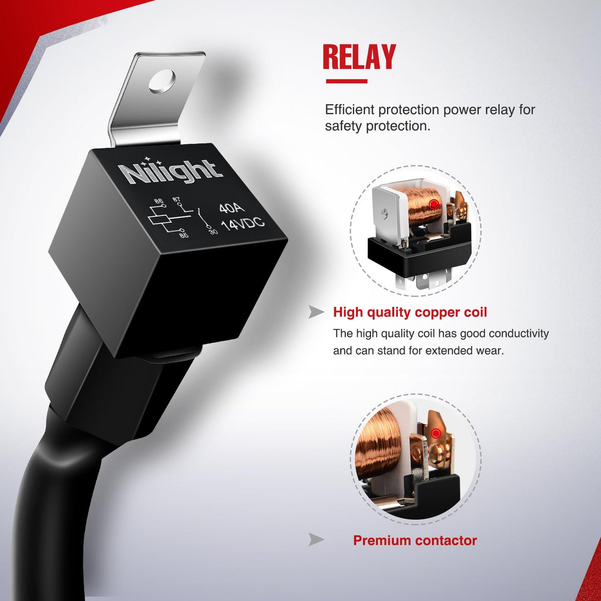 Heavy-duty Harness: 14 AWG stranded wire, up to 300 W load capacity. The harness is protected by power relay and inline blade fuse as the first Line of defense against overcurrent and short circuits | 5 Pin Rocker Switch: Nilight 5 pin on-off rocker switch with SPST design (single pole single Throw), simple installation, freely turn on or off the light. Built-in two premium LEDs emits soft light to illuminate the patterns, easy for you to find the switch in the dark | Durable Nylon Material: High-quality nylon jacket of the wiring harness kit provides superior durability, safety, flexibility and high-temperature resistance | Wide Application: This wiring harness is suitable for almost all 12V battery vehicles such as automotive cars, campers, RVs, ATVs, UTVs, motorcycles, ships yachts, and trailers | Package Includes: 1 x wiring harness kit, 1 x 5 Pin LED rocker switch, 1 x instructions, blade fuses and spade connectors