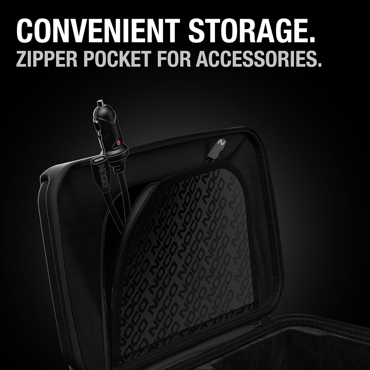 The GBC103 EVA Protective Case is a portable EVA protection case for GBX75 UltraSafe Lithium Jump Starters. It features a rugged and durable EVA material with a soft melange velvet lining for a secure, scratch-free fit, as well as precision steel-rimmed zippers, a built-in reinforced handle, and custom over-molded pull tabs.