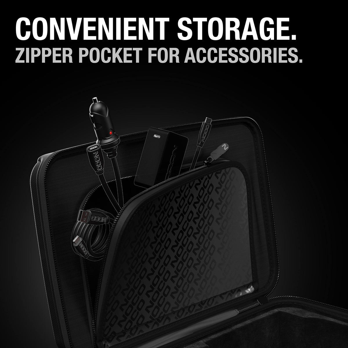 The GBC104 EVA Protective Case is a portable EVA protection case for GBX155 UltraSafe Lithium Jump Starters. It features a rugged and durable EVA material with a soft melange velvet lining for a secure, scratch-free fit, as well as precision steel-rimmed zippers, a built-in reinforced handle, and custom over-molded pull tabs.