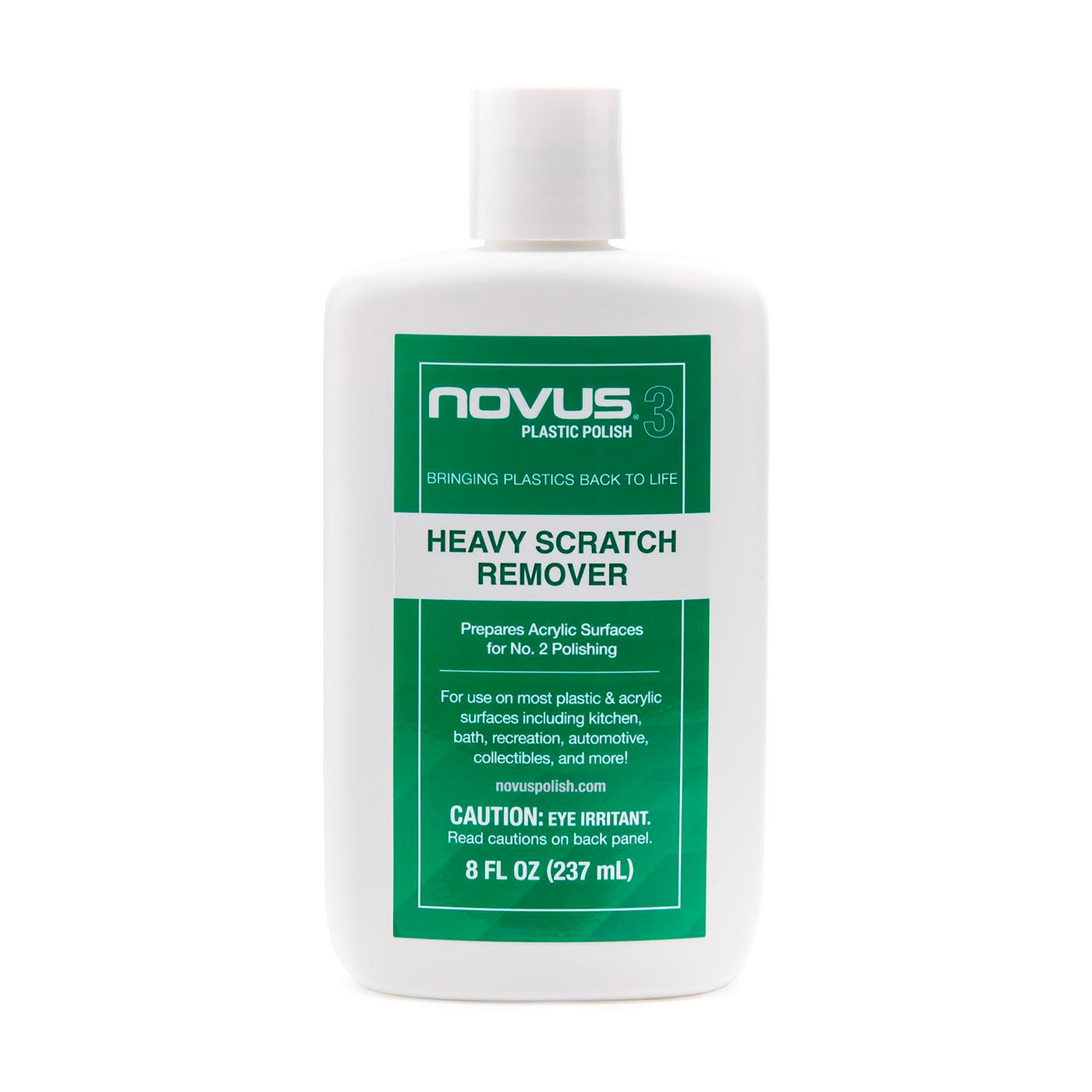 Instructions: 1. Shake well. Test in an inconspicuous area. 2. Apply NOVUS 3: NOVUS Heavy Scratch Remover liberally. Using clean, soft cloth, polish with a firm back-and-forth motion at right angles to the scratches. Keep the cloth saturated with polish at all times. 3. Continue polishing until only fine scratches remain. Using cloth, remove all remaining polish, this is very important! 4. Using a clean cloth, apply NOVUS scratch remover No. 2 in a circular motion uniformly to entire surface. Polish using light pressure until NOVUS No. 2 dries to a light haze. 5. Using a clean portion of the cloth, buff the surface clean. Follow with NOVUS No. 1 for best results.