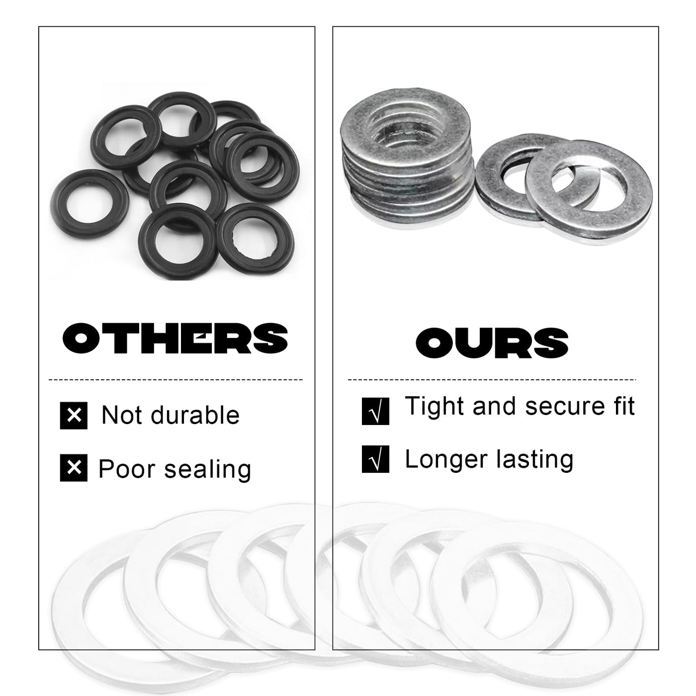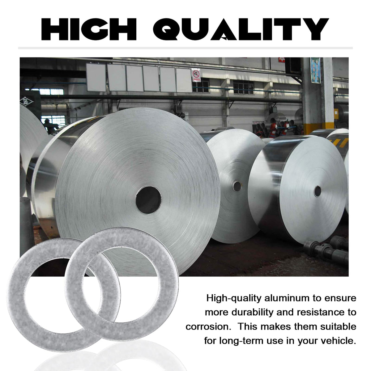 Q: How do these aluminum washers prevent oil leaks?A: These aluminum washers create a tight seal between the drain plug and the oil pan, effectively preventing oil from leaking, thanks to their durable construction and design.