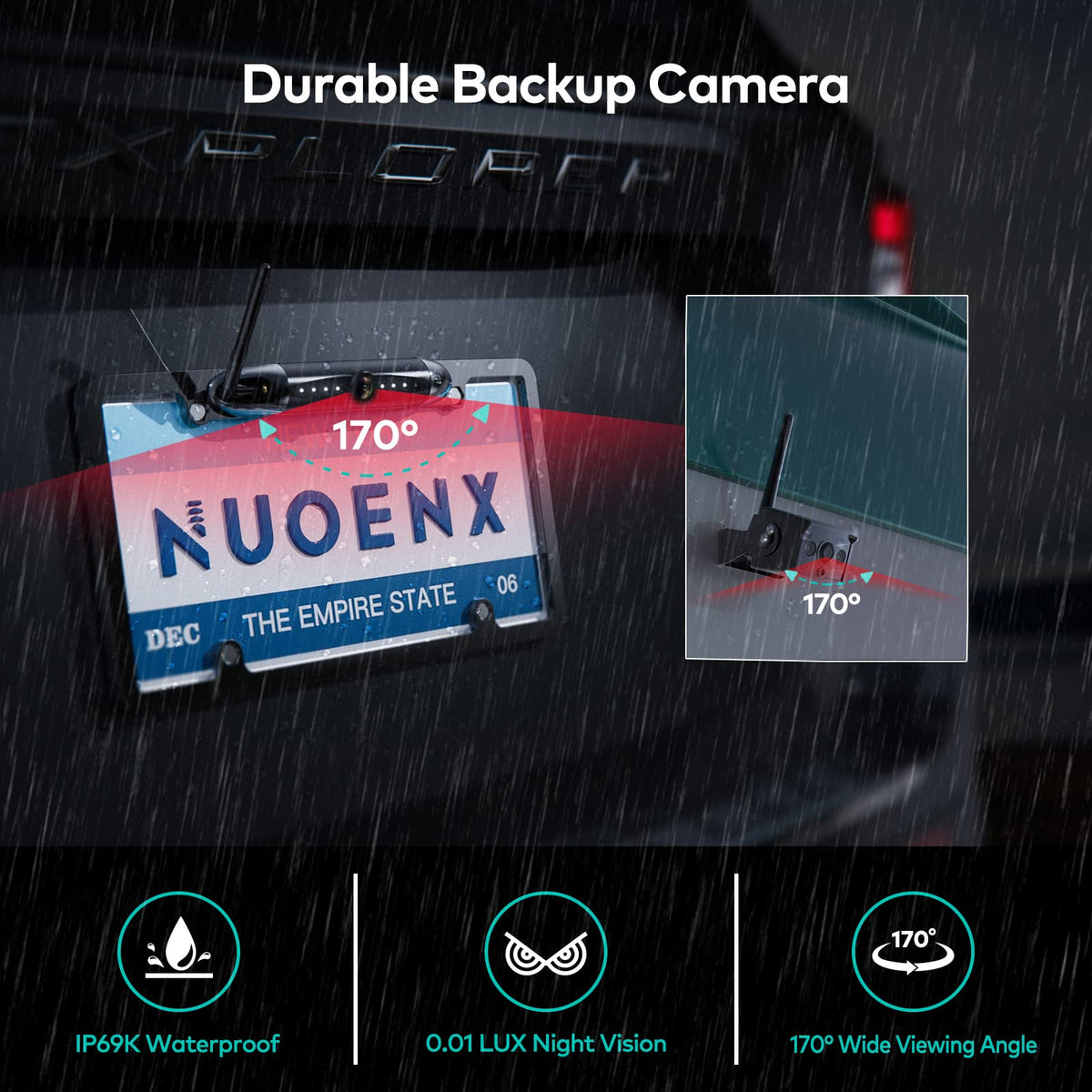 Q: Is the Nuoenx backup camera system waterproof?A: Yes, both the license plate backup camera and the rear view camera have an IP68K waterproof rating, ensuring durability and reliability even in rainy conditions.