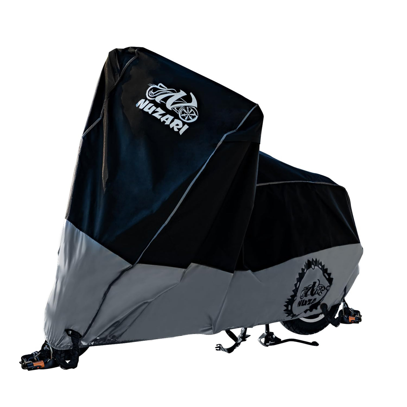 Q: What features contribute to the durability and security of this motorcycle cover?A: The Nuzari Motorcycle Cover includes a heavy-duty elastic bottom and an adjustable luggage strap for a snug fit, preventing it from blowing off in high winds. Additionally, it has lockable grommets that allow for chains and locks to secure the cover, enhancing its durability and theft protection.
