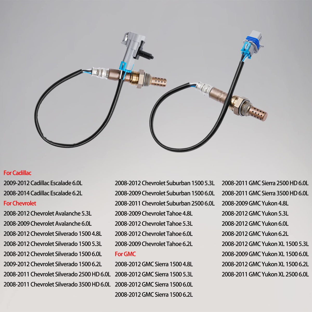 - Q: What vehicles are compatible with the O2 Oxygen Sensor? A: The O2 Oxygen Sensor is compatible with various models including the 2009-2012 Cadillac Escalade, 2008-2012 Chevrolet Silverado 1500, and 2008-2012 GMC Sierra 1500, among others. Please refer to the product description for a complete list of compatible models and years.